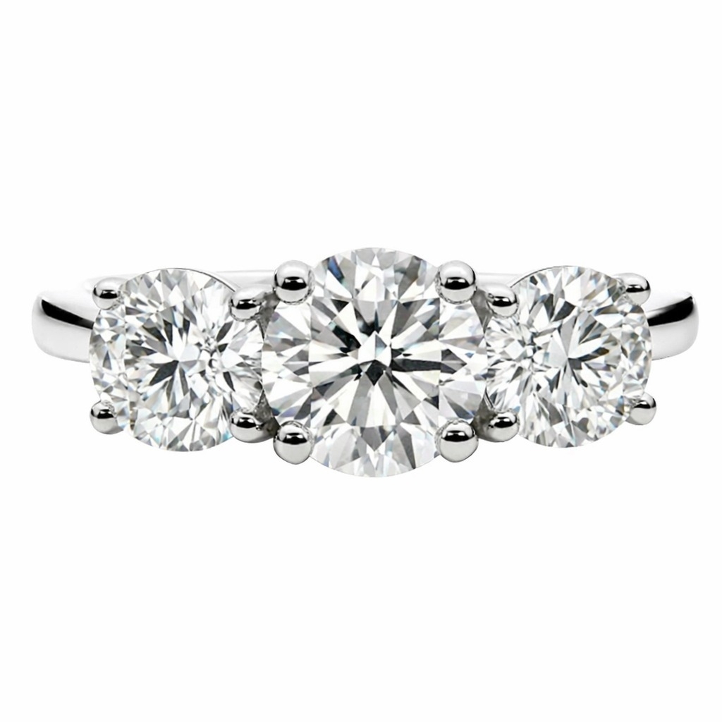 A brand-new, unused natural diamond three-stone eternity ring of substantial presence, set with three brilliant-cut natural diamonds with a combined weight of 2.01ct. Each diamond is GIA-certified, graded G for colour with clarity ranging from SI2 to I1, offering a bright, lively face-up appearance with intense brilliance and pleasing light performance. The three-stone arrangement creates a balanced, symmetrical profile across the finger, delivering impact while remaining timeless and versatile in style.
