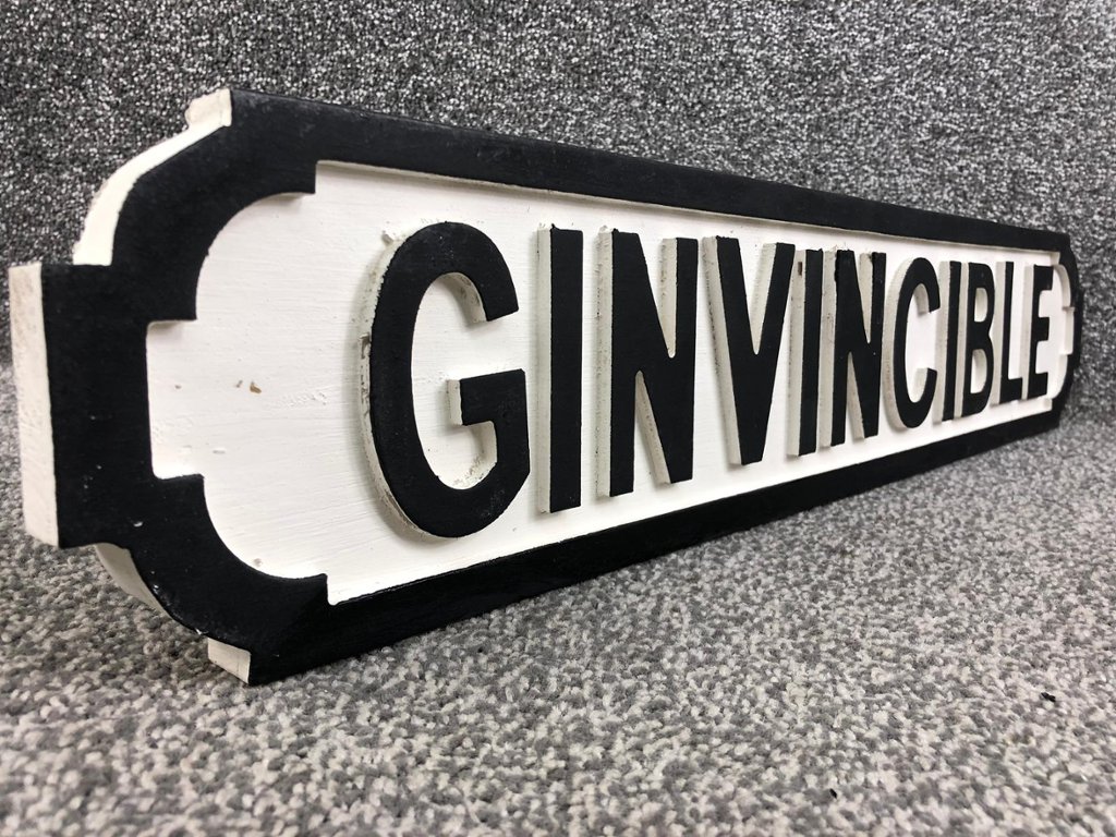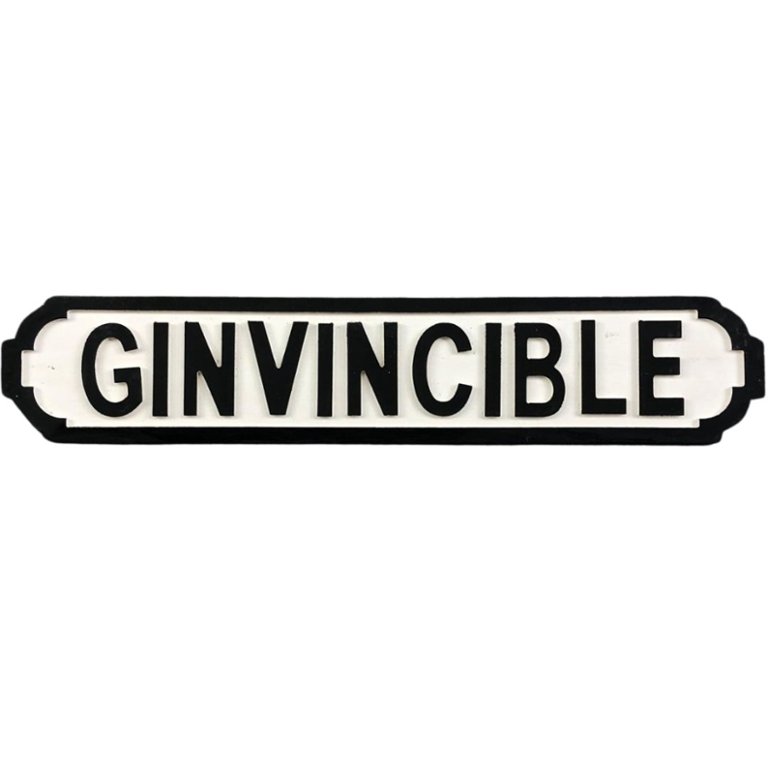 Crafted with a blend of playful charm and bold design, the sign features striking lettering against a backdrop that exudes a sense of vibrancy and excitement. The word "Ginvincible" is prominently displayed, conjuring images of fearless exploration and boundless enjoyment in the company of fine spirits.