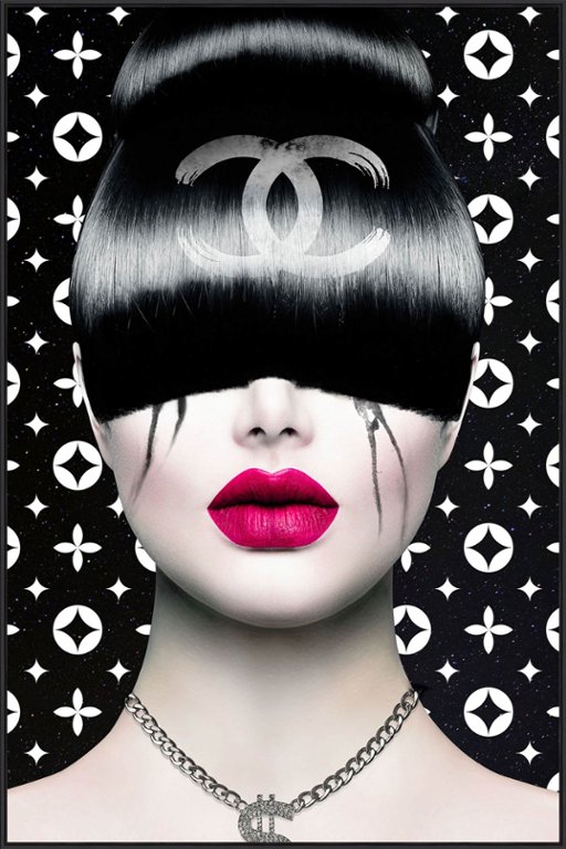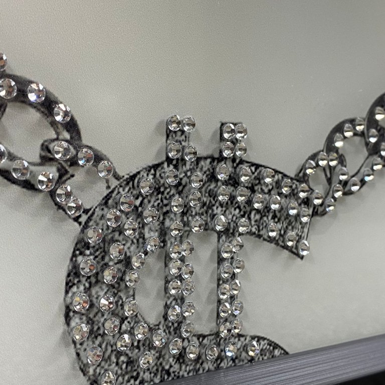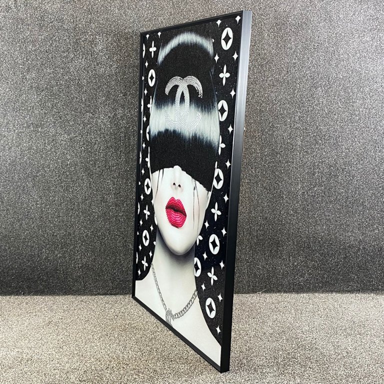 A Large Glass Art Picture featuring a striking portrayal of a large Fringe adorned with a designer logo, embellished with dazzling crystal accents, all encased within a sleek black frame.