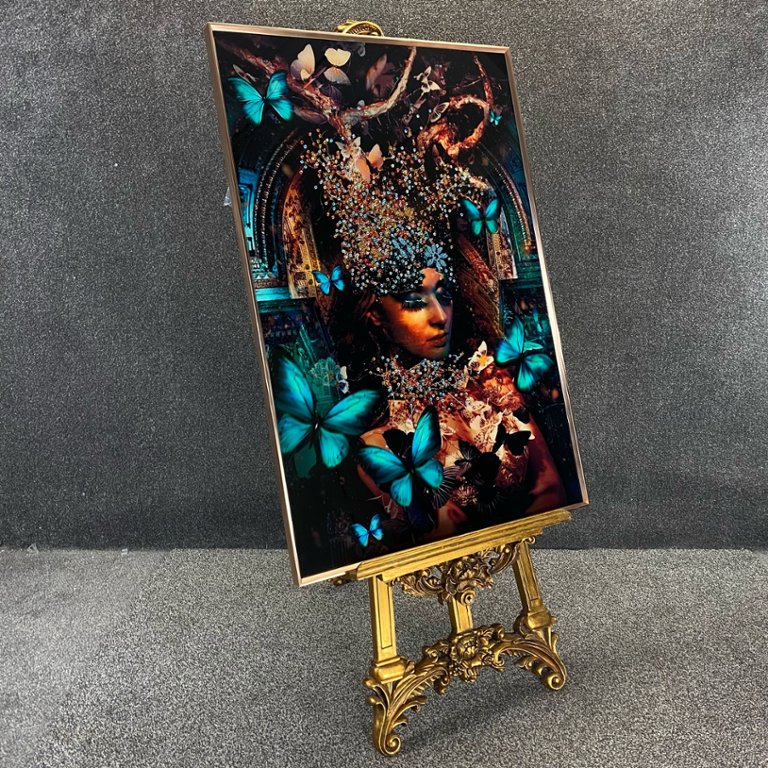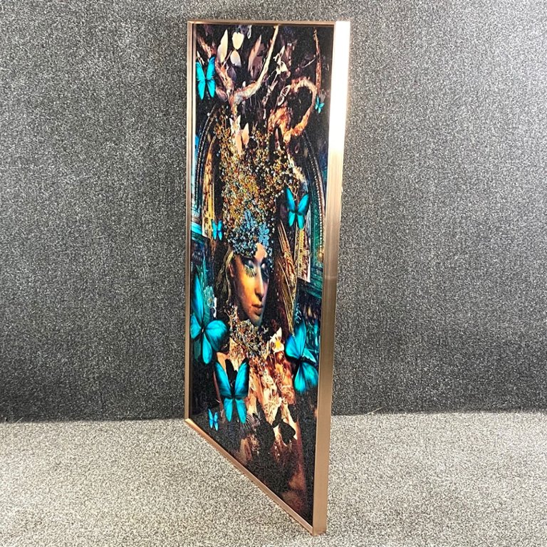 Immerse yourself in the enchanting beauty of our Large Glass Art Picture, featuring a captivating portrayal of a Mystical Girl surrounded by ethereal Blue Butterflies, adorned with delicate crystal embellishments, all elegantly presented within a lavish rose gold frame.