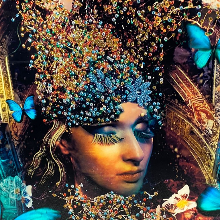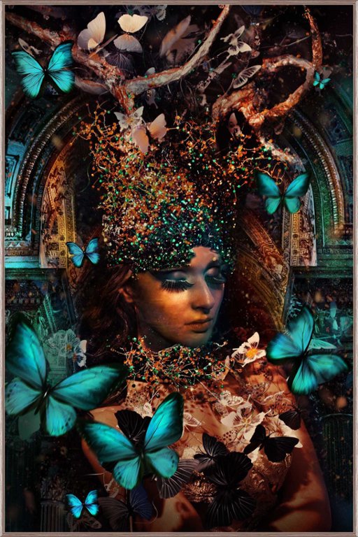 Standing majestically at 48 inches in height and 32 inches in width, this stunning artwork evokes a sense of wonder and fascination with its mystical theme and intricate details. The Mystical Girl, with her serene expression and graceful demeanour, exudes an aura of otherworldly charm and mystique while the Blue Butterflies flutter around her in a mesmerising dance of beauty and grace.