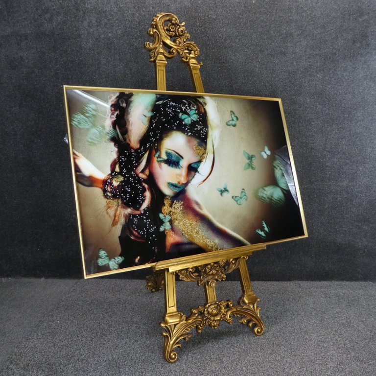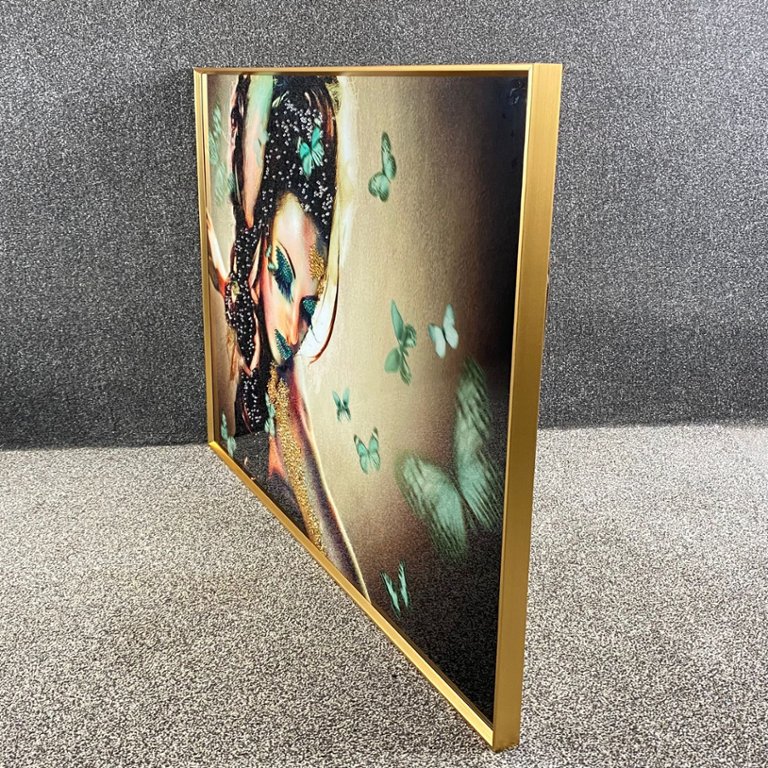 The graceful movement of the butterflies around the lady creates a sense of whimsy and wonder, while the shimmering crystals add a touch of elegance and sophistication. Set against a backdrop of glass, the artwork exudes a sense of lightness and transparency, enhancing the ethereal quality of the scene. Whether displayed in a living room, bedroom, or office, this piece serves as a striking focal point, infusing your space with charm, beauty, and a hint of magic. Embrace the enchanting allure of nature and artistic expression captured in this stunning artwork, which promises to captivate and inspire admiration for years to come.