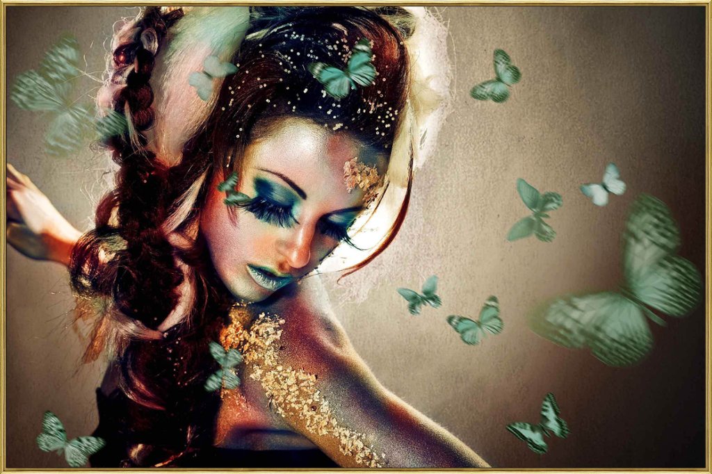 A Large Glass Art Picture featuring a graceful Lady adorned with vibrant Green Butterflies and delicate crystal embellishments, all elegantly showcased within a luxurious gold frame. This captivating artwork, measuring generously at 48" in height and 32" in width, commands attention with its intricate detailing and mesmerising composition.