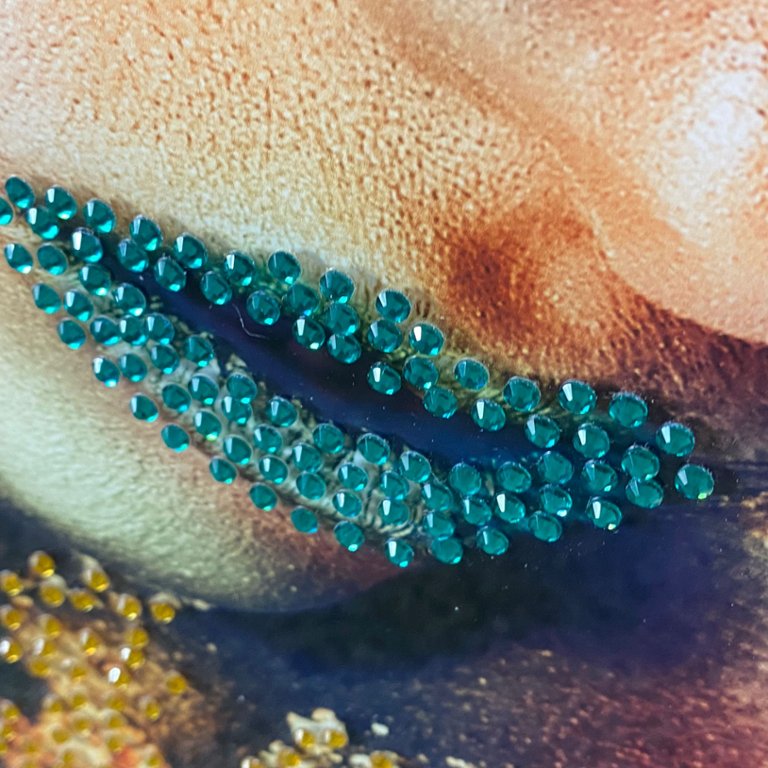 A Glass Art Picture of a Lady with Green Butterflies with crystal embellishment in a gold frame.