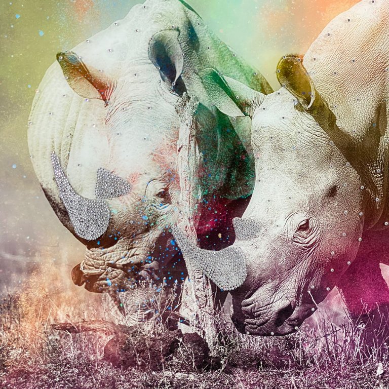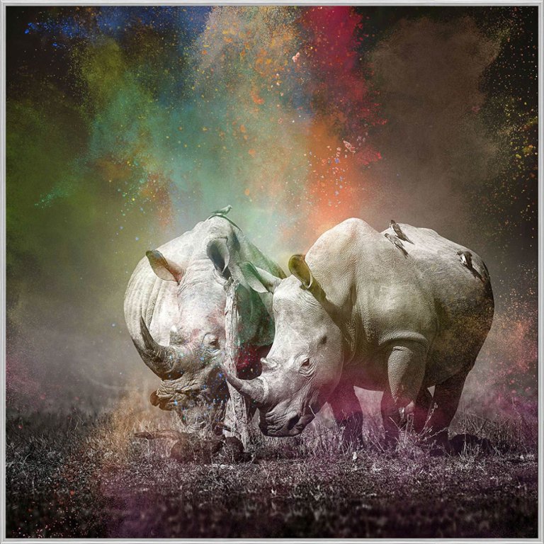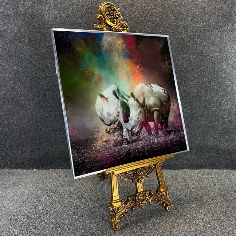 A Glass Art Picture of a Paint Splash Rhino Scene with crystal embellishment in a silver frame.