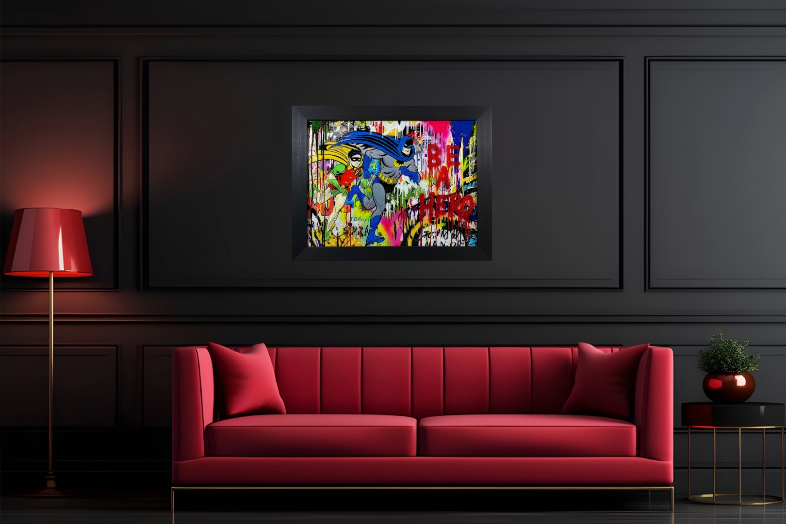 A Glass Art Picture featuring Batman and Robin running against a graffiti backdrop with the inspiring message "Be a hero" is a dynamic and empowering artwork. Measuring 30 inches in height and 42 inches in width, it captures the essence of heroism and adventure, making it a striking addition to any space.