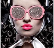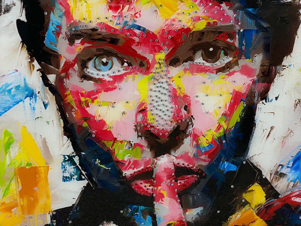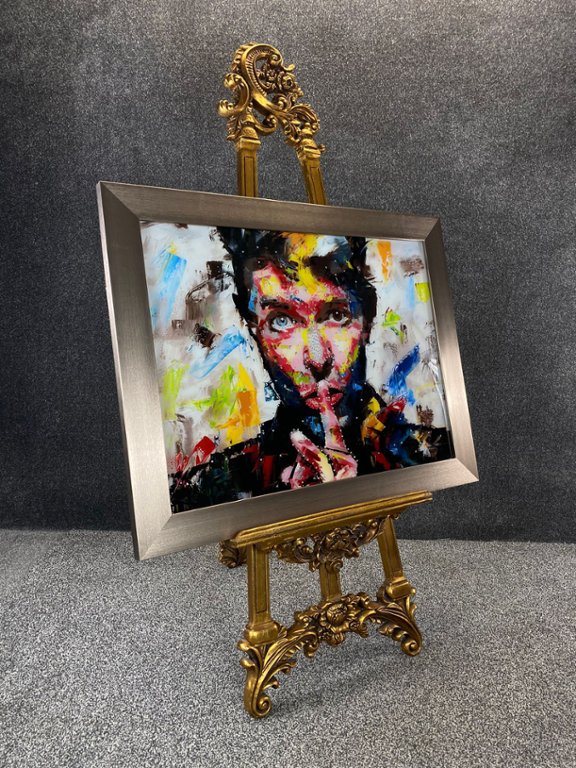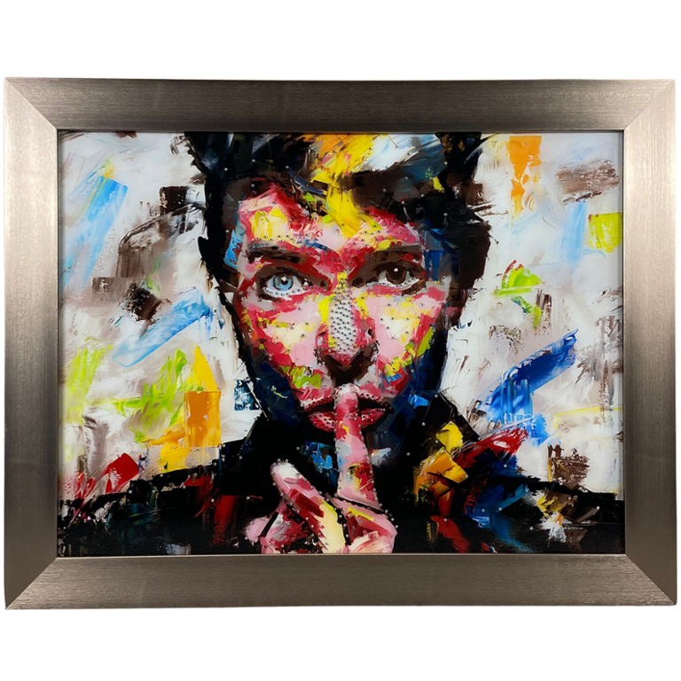 A glass art picture featuring an abstract representation of David Bowie holding his finger over his lips in a shushing gesture, enhanced with exquisite crystal embellishments and elegantly framed in champagne. This captivating artwork pays homage to the legendary musician and cultural icon, capturing the essence of his enigmatic persona and artistic legacy in a visually dynamic composition.