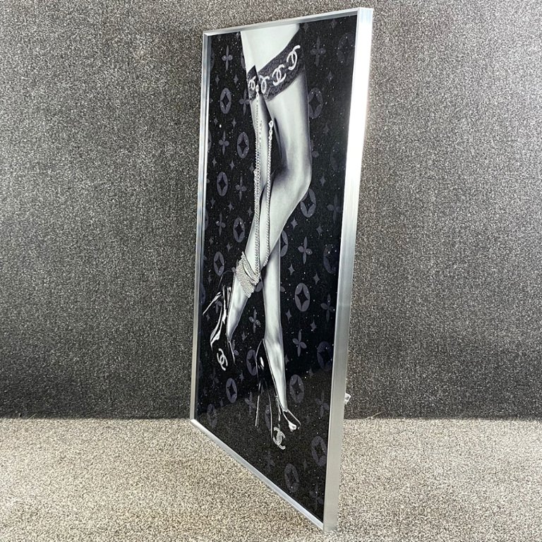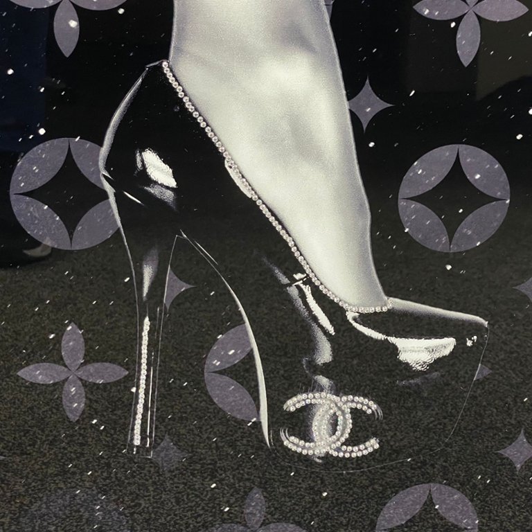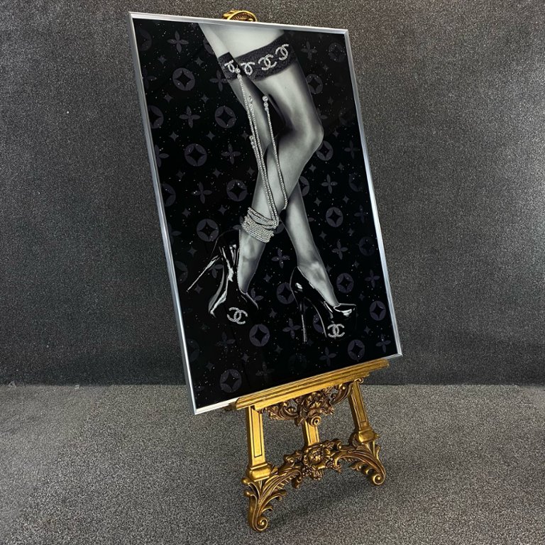 Standing grandly at 48 inches in height and 32 inches in width, this exquisite artwork exudes a sense of luxury and refinement. The imagery of the graceful Legs adorned with pearls evokes a sense of glamour and sensuality, while the designer logo background adds a touch of chic style and sophistication.