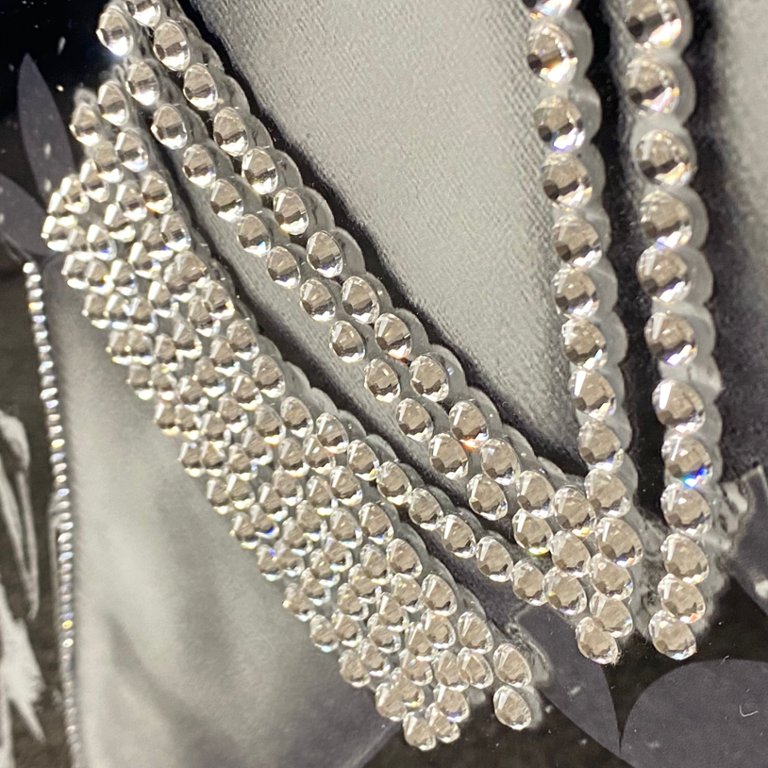 Indulge in the allure of sophistication with our captivating large glass art picture. It showcases the timeless elegance of ladies' Legs adorned in stockings, delicately accented with pearl strings, set against a backdrop featuring a designer logo, all embellished with shimmering crystals, encased in a sleek silver frame.