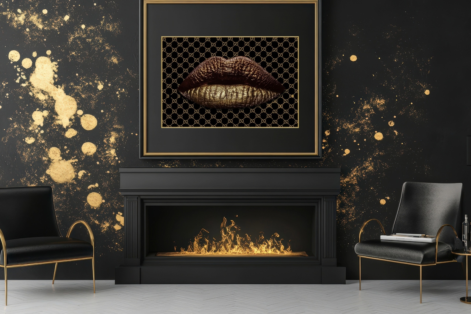 A Large Glass Art Picture featuring luscious Gold Lips set against a designer backdrop. Adorned with delicate crystal embellishments, this artwork exudes opulence and style.