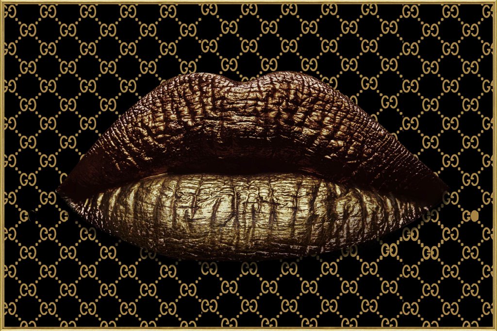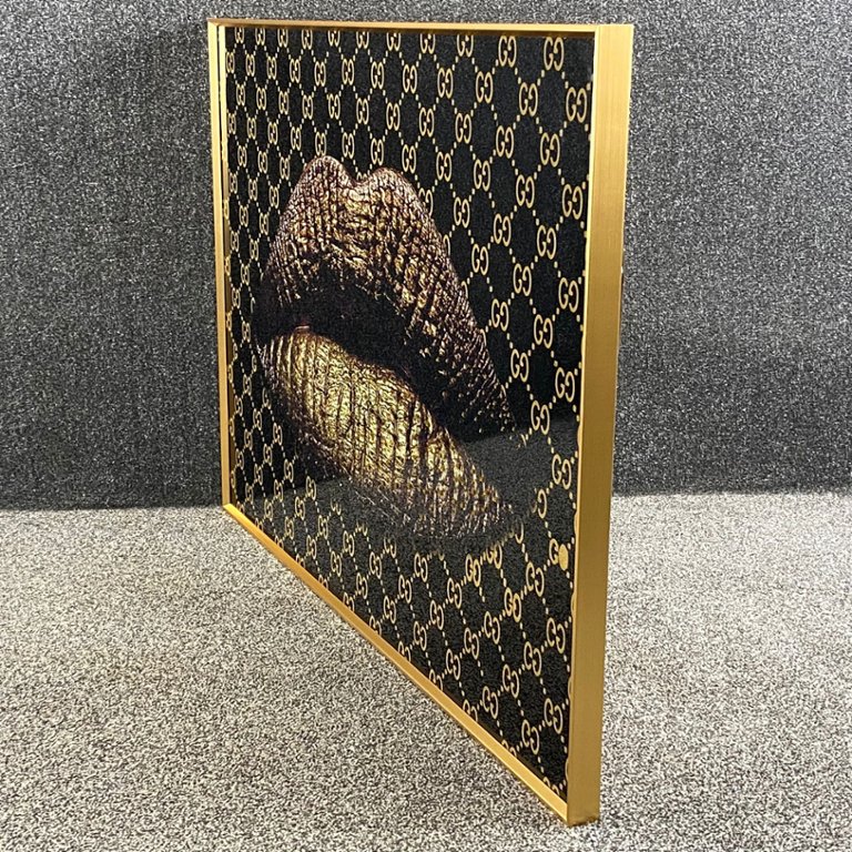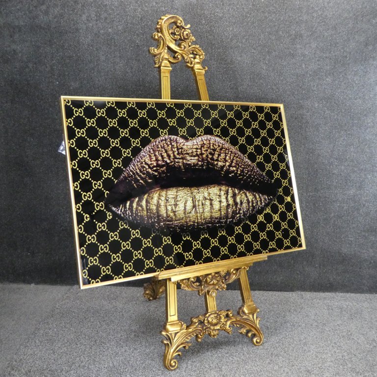 - > Glass Art Picture of Gold Designer Lips - B