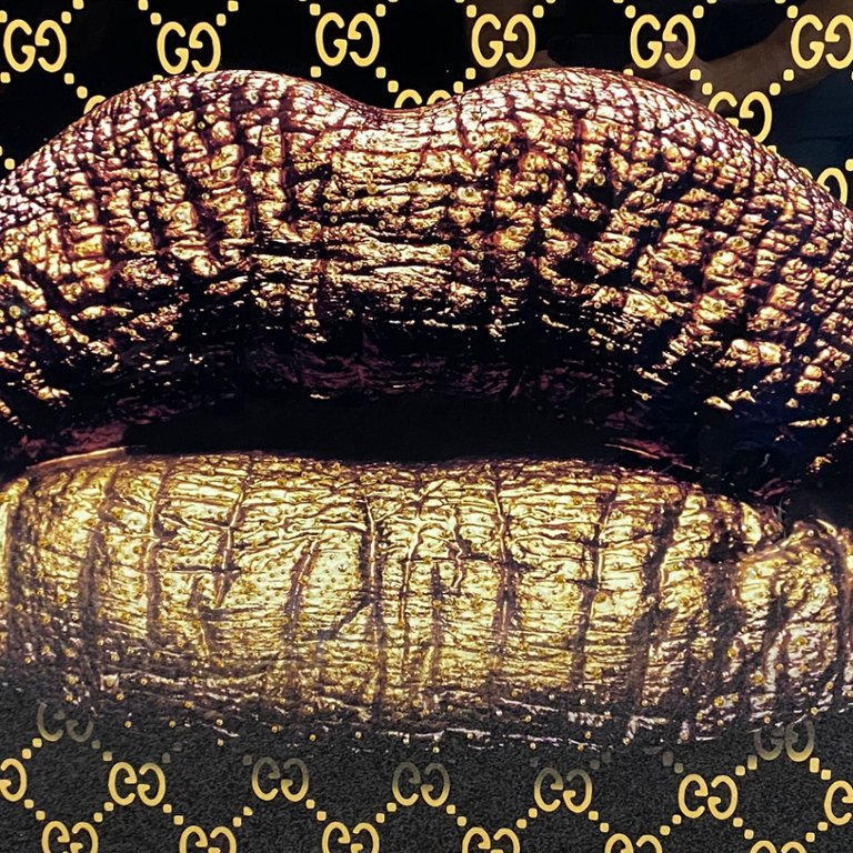 Encased within a luxurious gold frame measuring 32 inches in height and 48 inches in width, this piece adds a touch of elegance to any space. The shimmering crystals accentuate the beauty of the lips, creating a dazzling focal point that commands attention and ignites the imagination.
