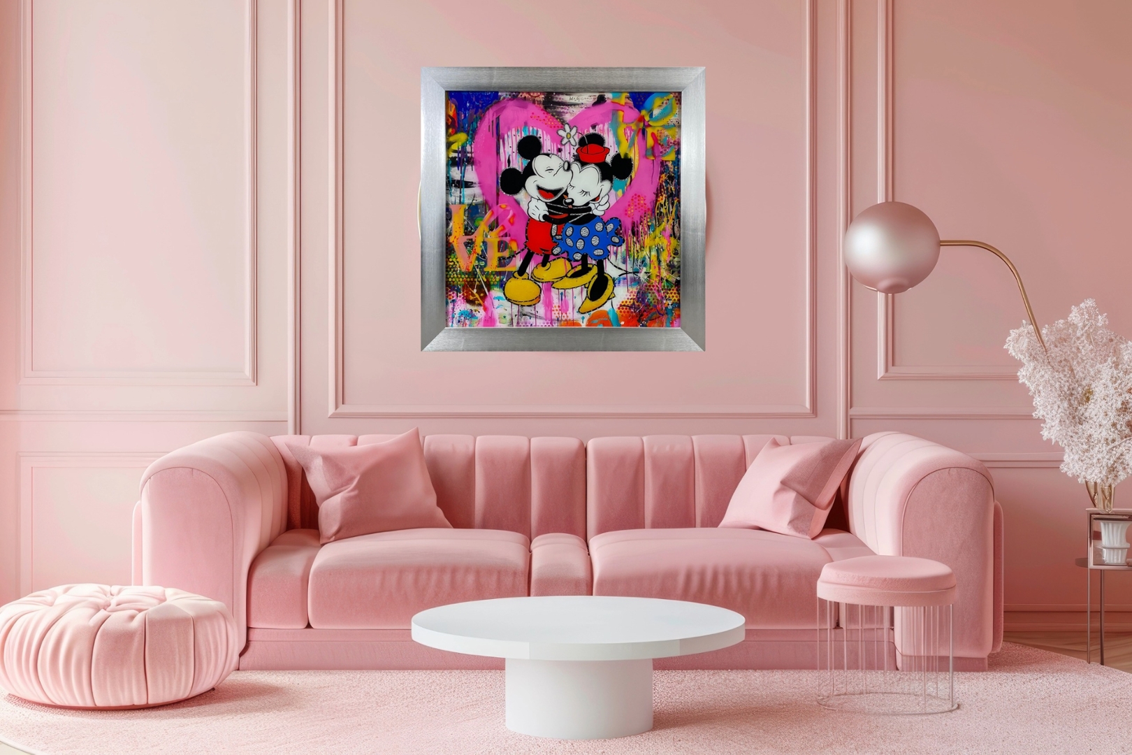 At the centre of the artwork, Mickey and Minnie are depicted in a tender embrace, symbolizing love and affection. The graffiti wall background adds a dynamic and urban feel to the composition, while the word "Love" stands out as a powerful reminder of the theme of the artwork.