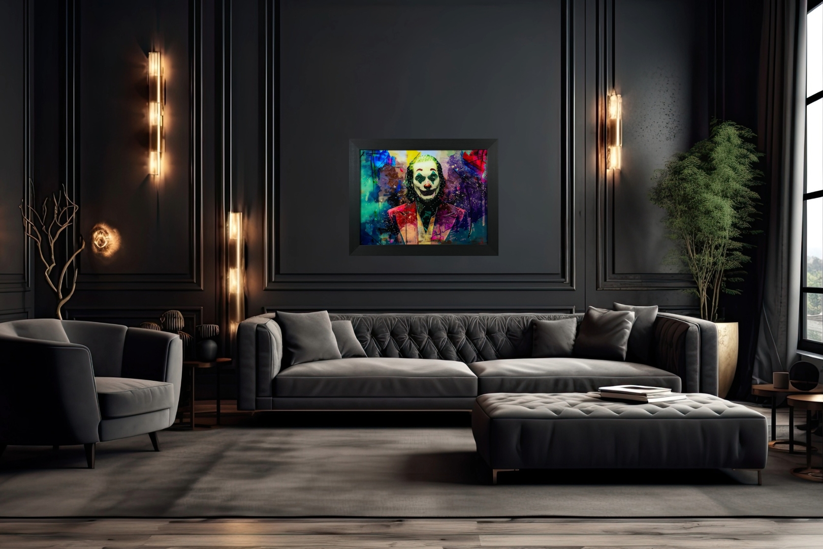 A Glass Art Picture presents Joaquin Phoenix's haunting portrayal of the Joker, capturing the essence of his mesmerizing performance with exquisite detail. Crystal embellishments tastefully adorn the artwork, adding a touch of sophistication and allure to the depiction and enhancing the Joker's enigmatic persona. Encased within a sleek black frame, the piece exudes a sense of mystery and elegance, complementing the character's dark and mysterious nature.