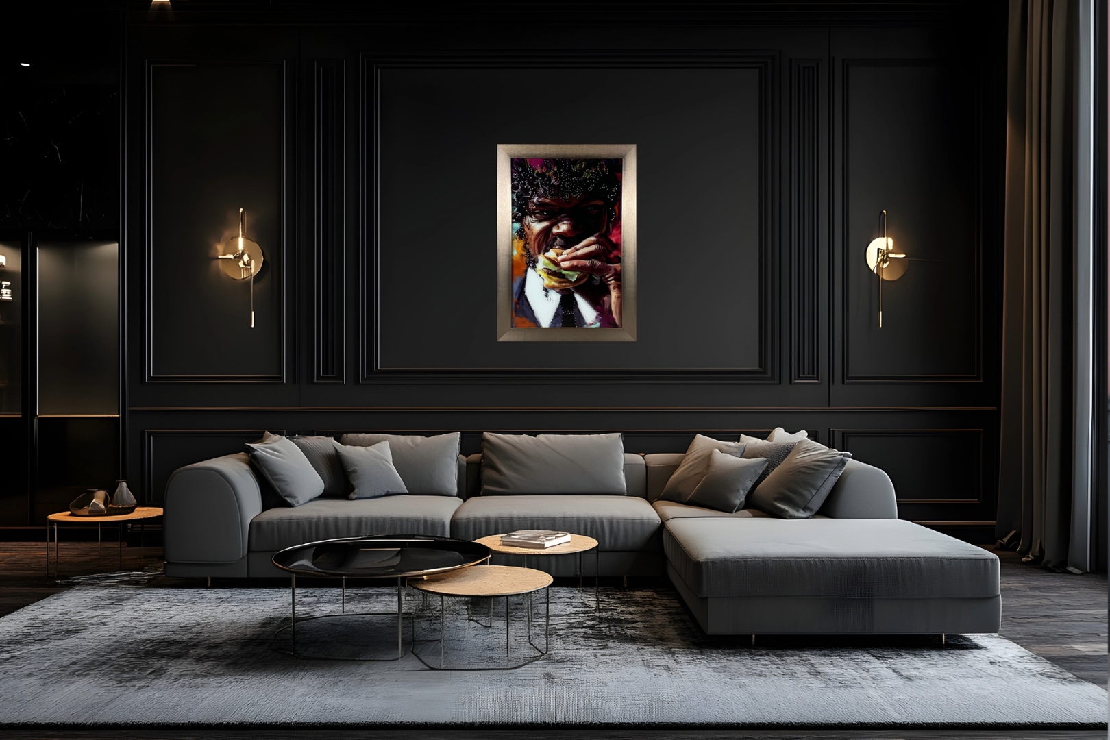 Overall, the Glass Art Picture of Samuel L. Jackson in "Pulp Fiction" enjoying a Big Mac offers a captivating glimpse into the world of cinema and pop culture. It serves as a striking statement piece, infusing interiors with personality and style while paying homage to an iconic film moment.