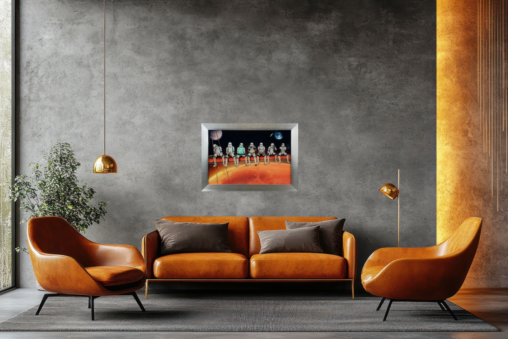 A Glass Art Picture portraying Storm Troopers enjoying lunch atop a skyscraper is a whimsical and imaginative piece that blends the iconic imagery of Star Wars with a touch of humour and modern urban life. With dimensions measuring 30 inches in height and 42 inches in width, this artwork makes a bold statement and adds a unique conversation starter to any space.