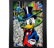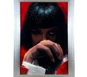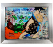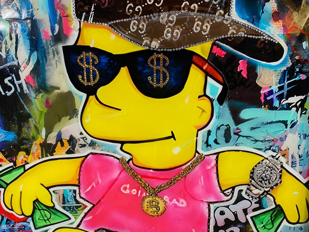 Encased in a sleek black frame, this piece exudes modernity and edginess, strikingly contrasting the vibrant imagery. The addition of crystal embellishments adds an extra dimension of sparkle and allure, enhancing Bart's fashionable ensemble and drawing the viewer's eye to every detail.