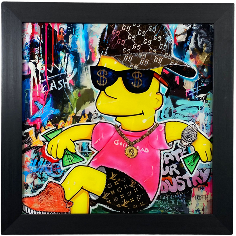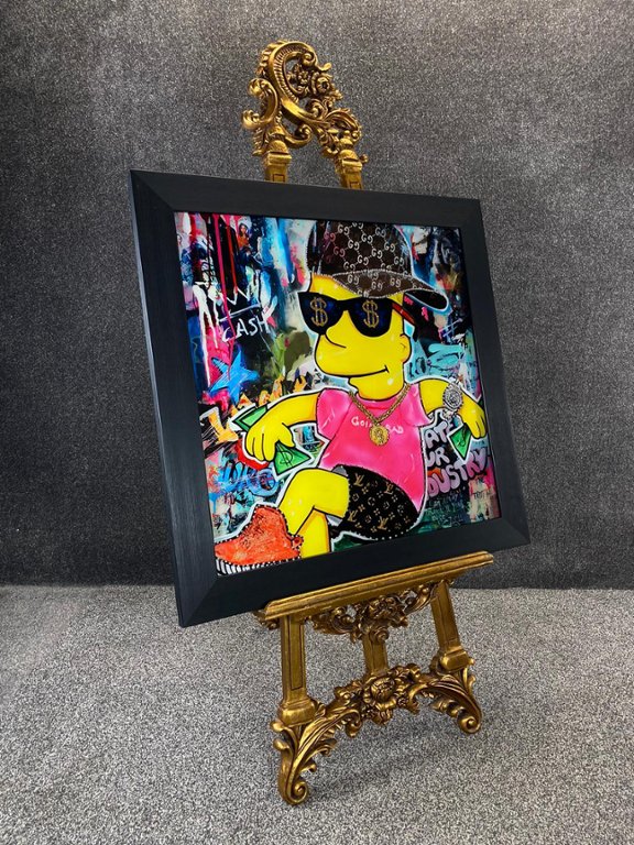 A glass art picture featuring the iconic Bart Simpson adorned in stylish designer clothes, a trendy cap, and sporting a watch, all enhanced with sparkling crystal embellishments. This captivating artwork is elegantly framed in sleek black, adding a touch of sophistication to its whimsical charm.