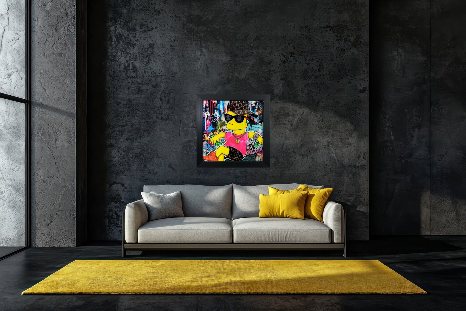 Encased in a sleek black frame, this piece exudes modernity and edginess, strikingly contrasting the vibrant imagery. The addition of crystal embellishments adds an extra dimension of sparkle and allure, enhancing Bart's fashionable ensemble and drawing the viewer's eye to every detail.