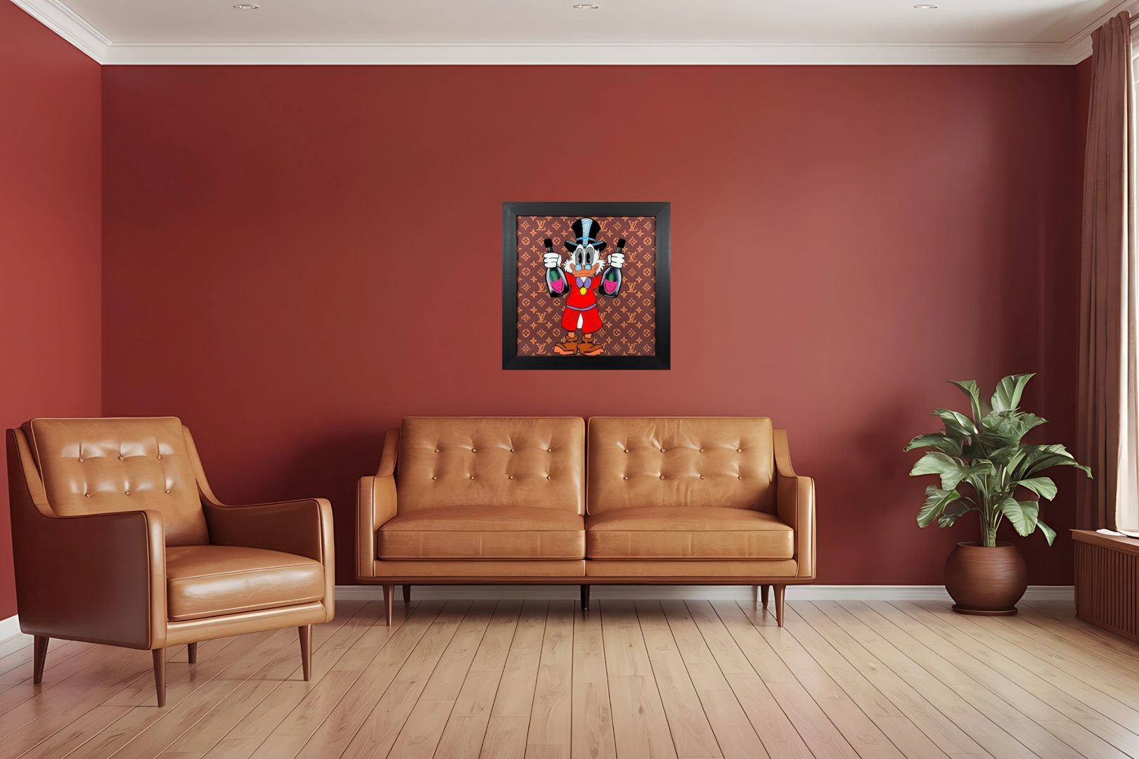 Measuring 36 inches in height and 36 inches in width, this glass art picture serves as a bold statement piece in any room. The portrayal of Scrooge McDuck, known for his wealth and extravagant lifestyle, exudes a sense of luxury and indulgence. At the same time, the designer background and champagne bottles add a touch of sophistication and glamour.