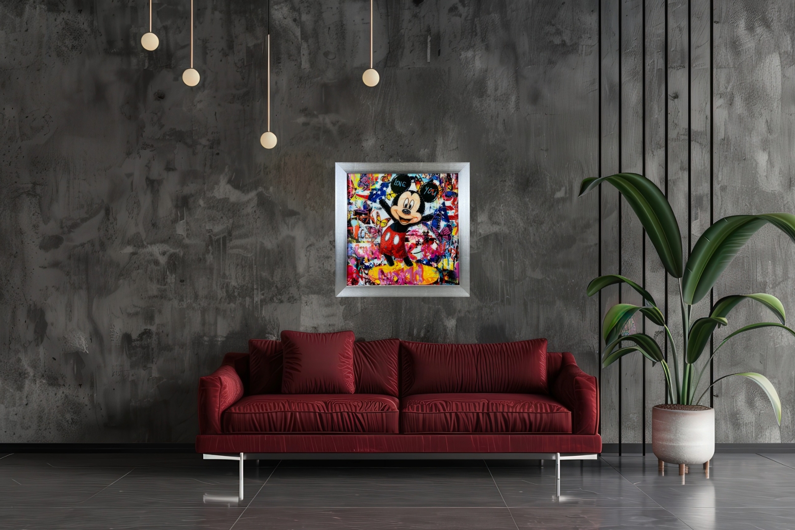 A glass art picture featuring Mickey Mouse against a graffiti wall backdrop adorned with the words "I love you," enhanced with sparkling crystal embellishments, and elegantly framed in silver. This delightful artwork combines the timeless appeal of Mickey Mouse with the modern urban aesthetic, creating a visually captivating composition that adds a touch of whimsy and romance to any space.