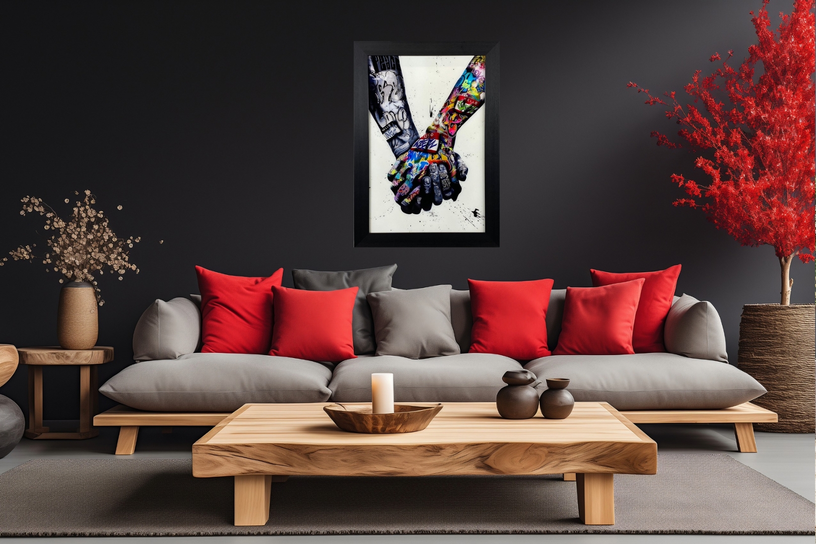 A glass art picture featuring two hands entwined amidst colourful graffiti, adorned with delicate crystal embellishments, and elegantly framed in sleek black. This striking artwork celebrates the beauty of human connection and expression, inviting viewers to reflect on the bonds that unite us and the vibrant diversity of urban culture.