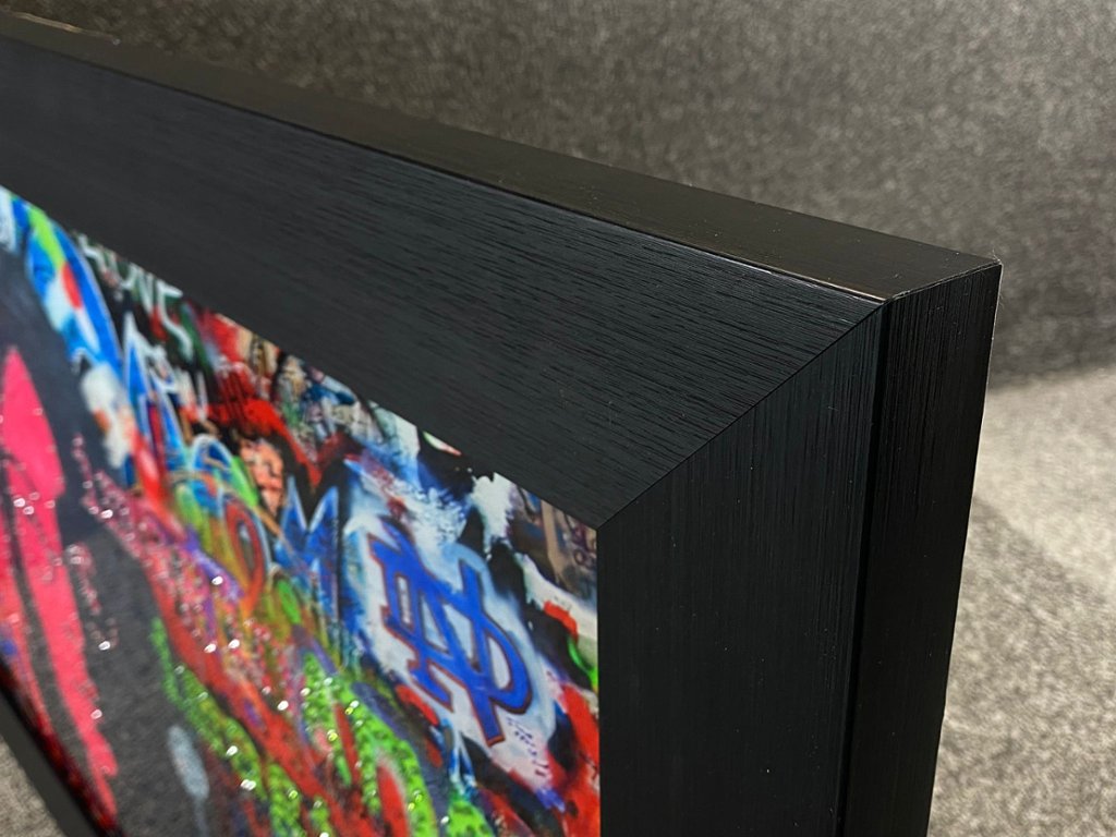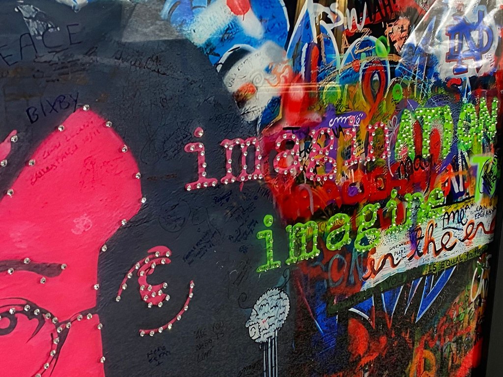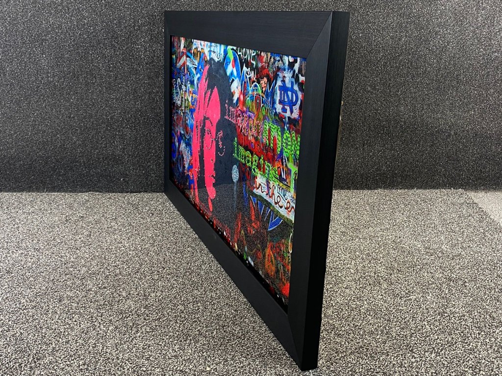 A glass art picture featuring the iconic silhouette of John Lennon, initially found on a wall in Prague, adorned with sparkling crystal embellishments and elegantly framed in black. This stunning artwork pays homage to the legendary musician and peace activist, capturing the essence of his spirit and influence in a visually striking composition.