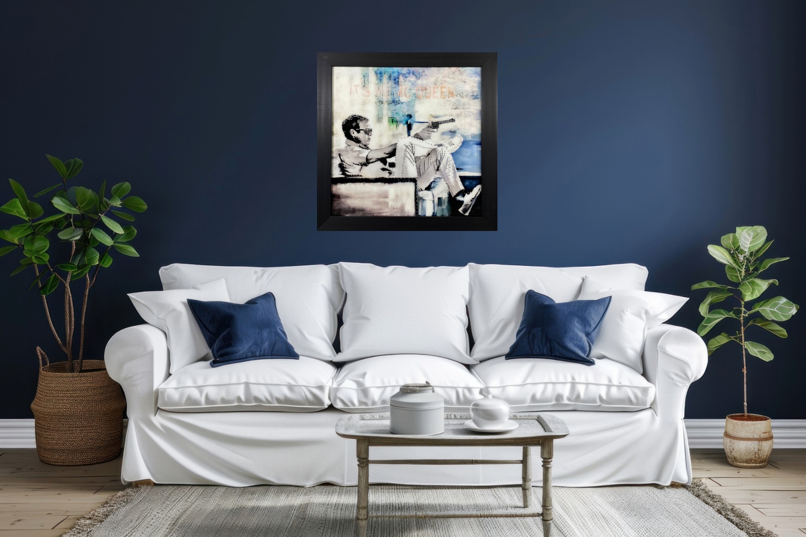 Introducing "The King of Cool" – a captivating glass art picture featuring the iconic Steve McQueen exuding effortless charisma as he sits on a sofa, holding a gun. Enhanced with delicate crystal embellishments, this stunning artwork is elegantly framed in sleek black, adding a touch of sophistication to its timeless allure.