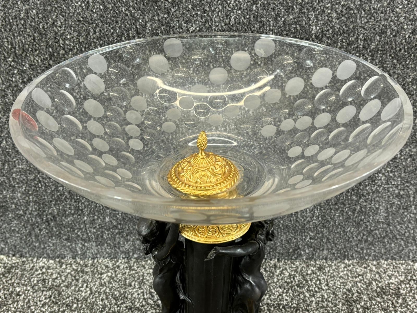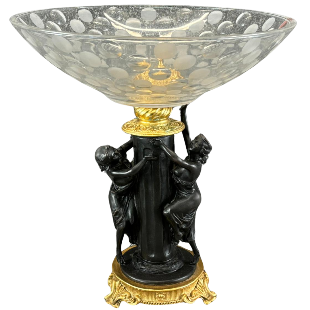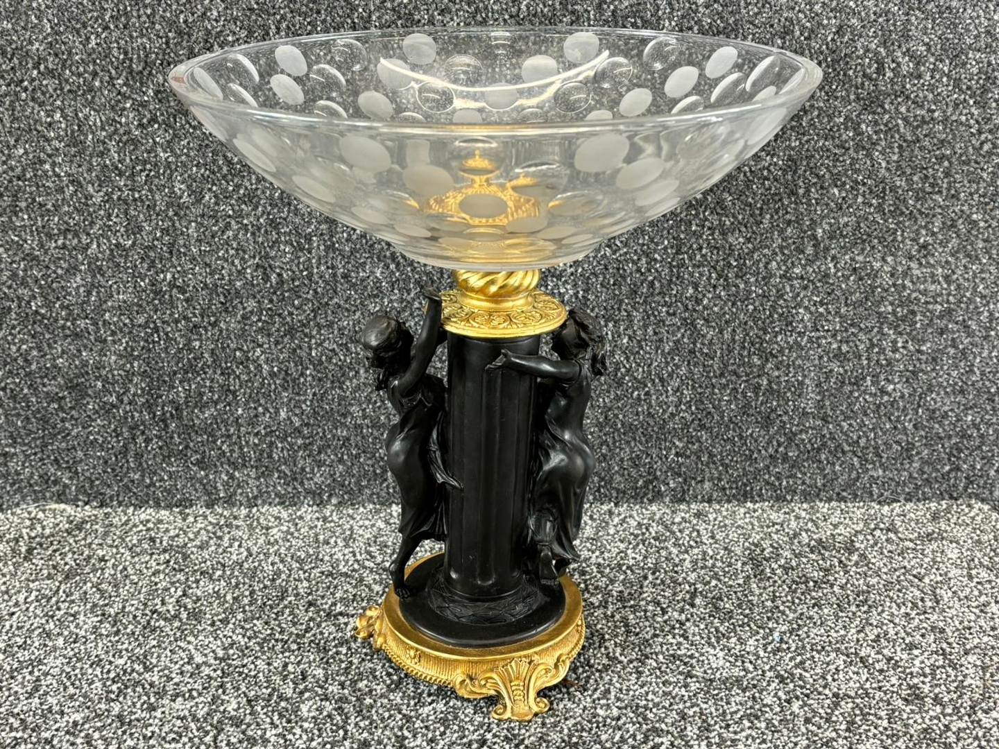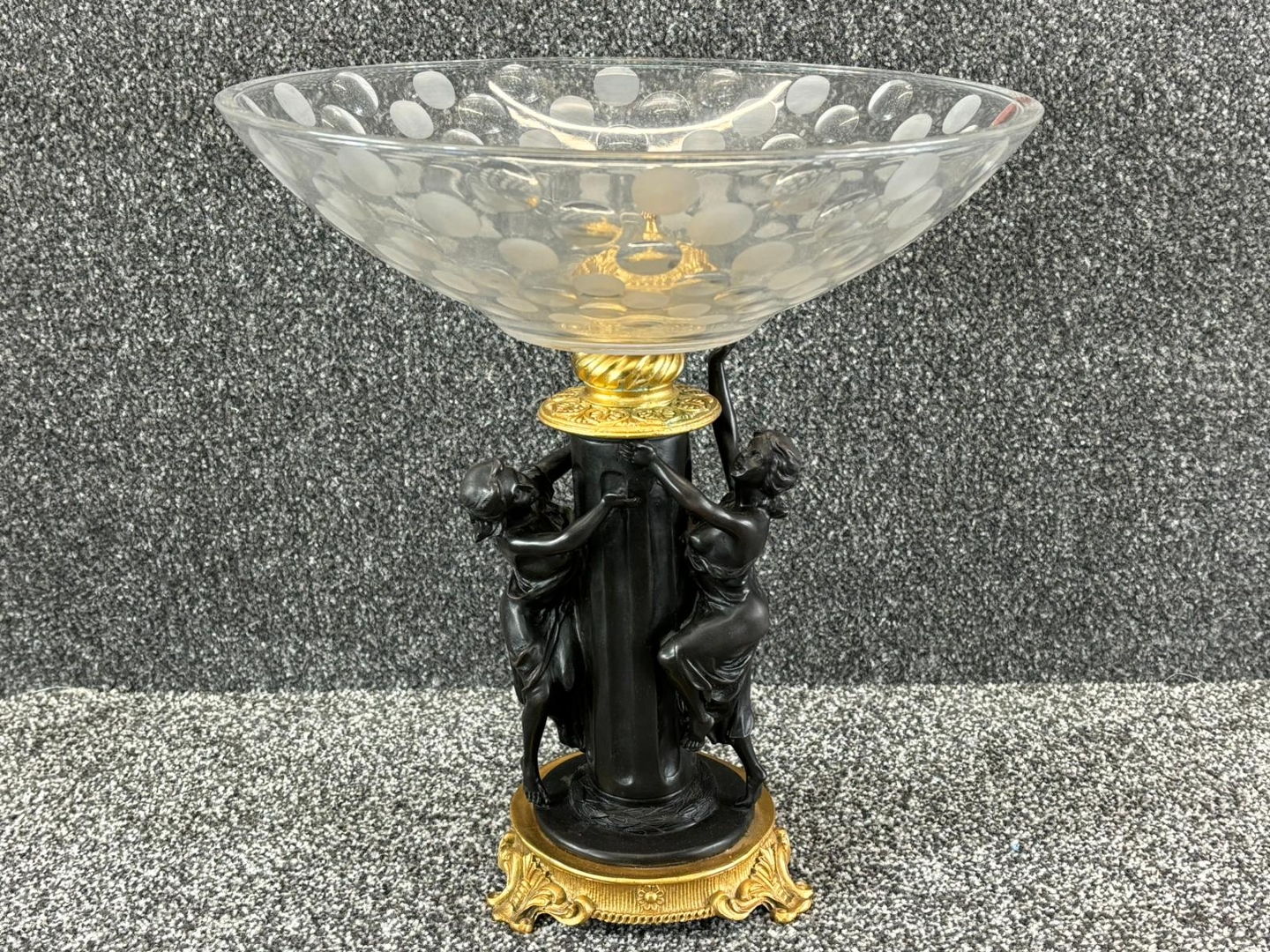 A glass top gilded bronze fruit bowl, a stunning blend of elegance and artistry. Measuring approximately 37cm in height, 33cm in width, and 33cm in depth, this beautifully crafted piece serves as both a functional fruit bowl and a striking decorative centrepiece. The intricately detailed bronze base features two gracefully sculpted figures embracing a classical column, adding a timeless and sophisticated touch to the design.