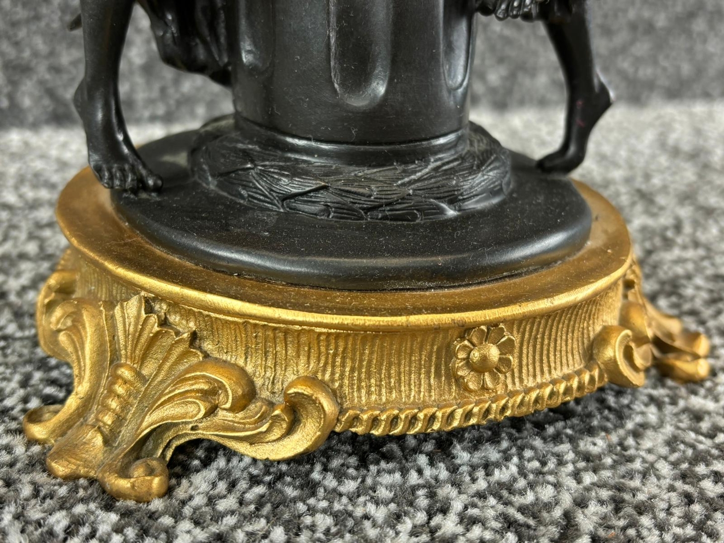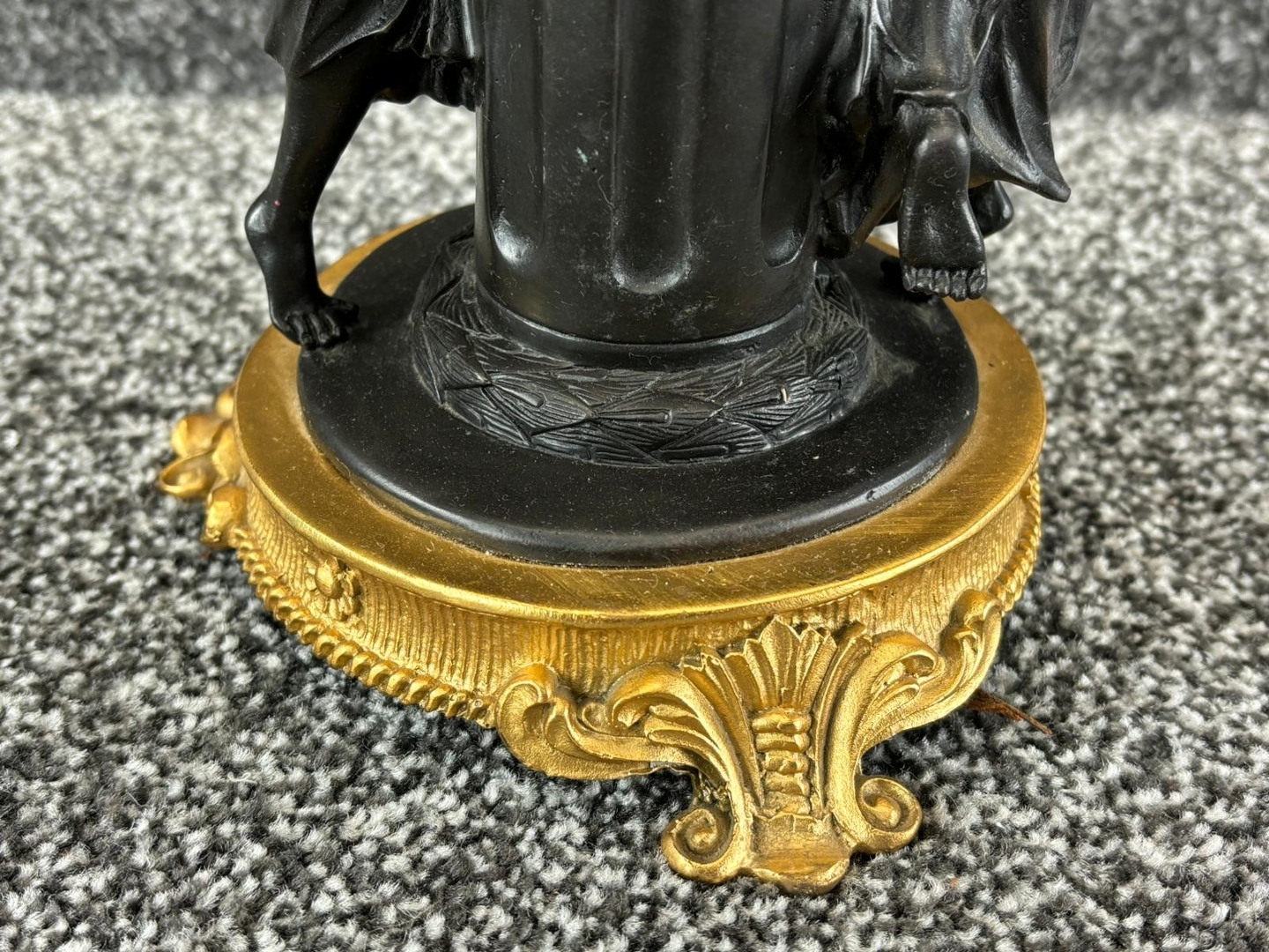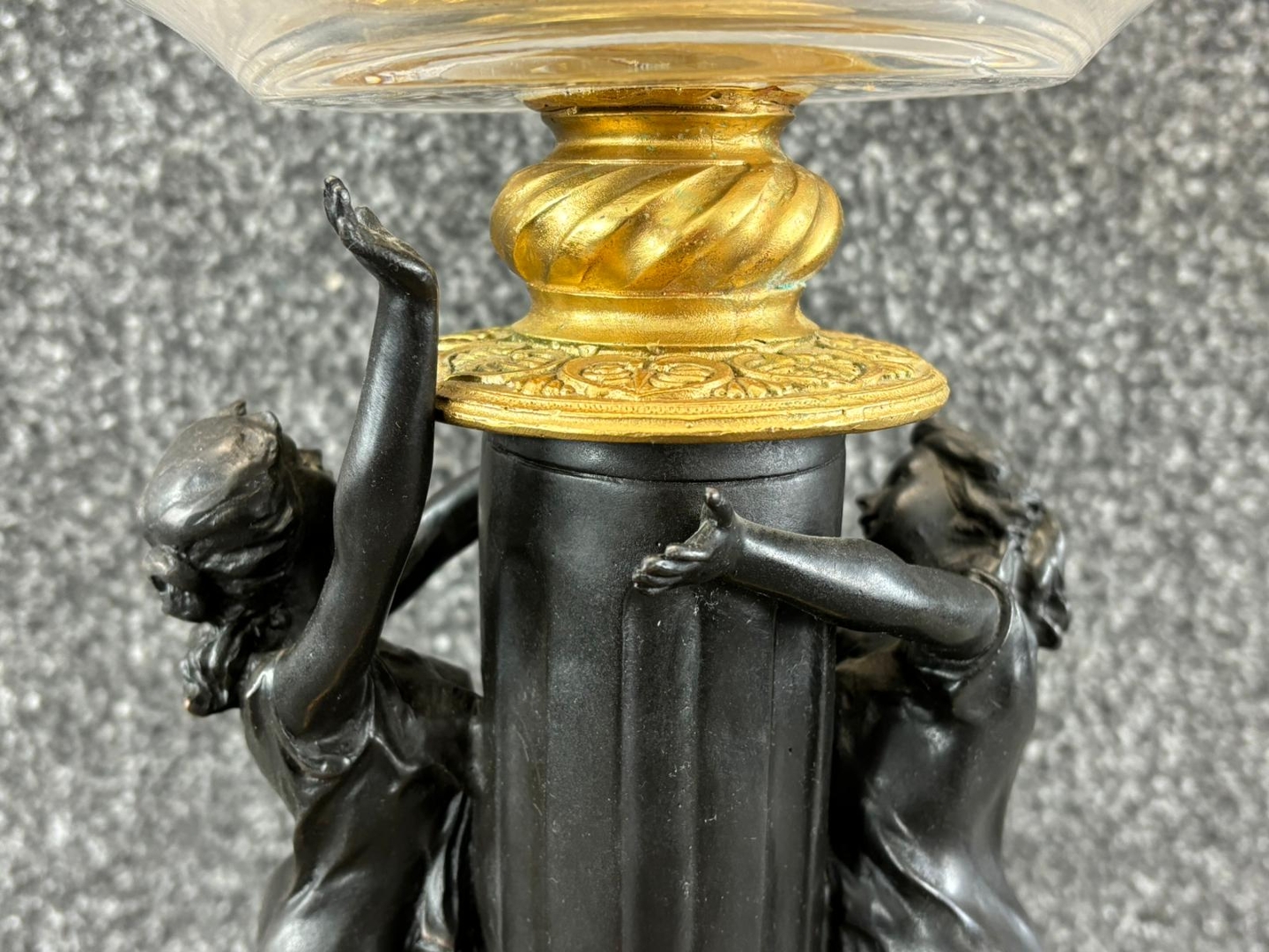 A glass top gilded bronze fruit bowl, a stunning blend of elegance and artistry. Measuring approximately 37cm in height, 33cm in width, and 33cm in depth, this beautifully crafted piece serves as both a functional fruit bowl and a striking decorative centrepiece. The intricately detailed bronze base features two gracefully sculpted figures embracing a classical column, adding a timeless and sophisticated touch to the design.