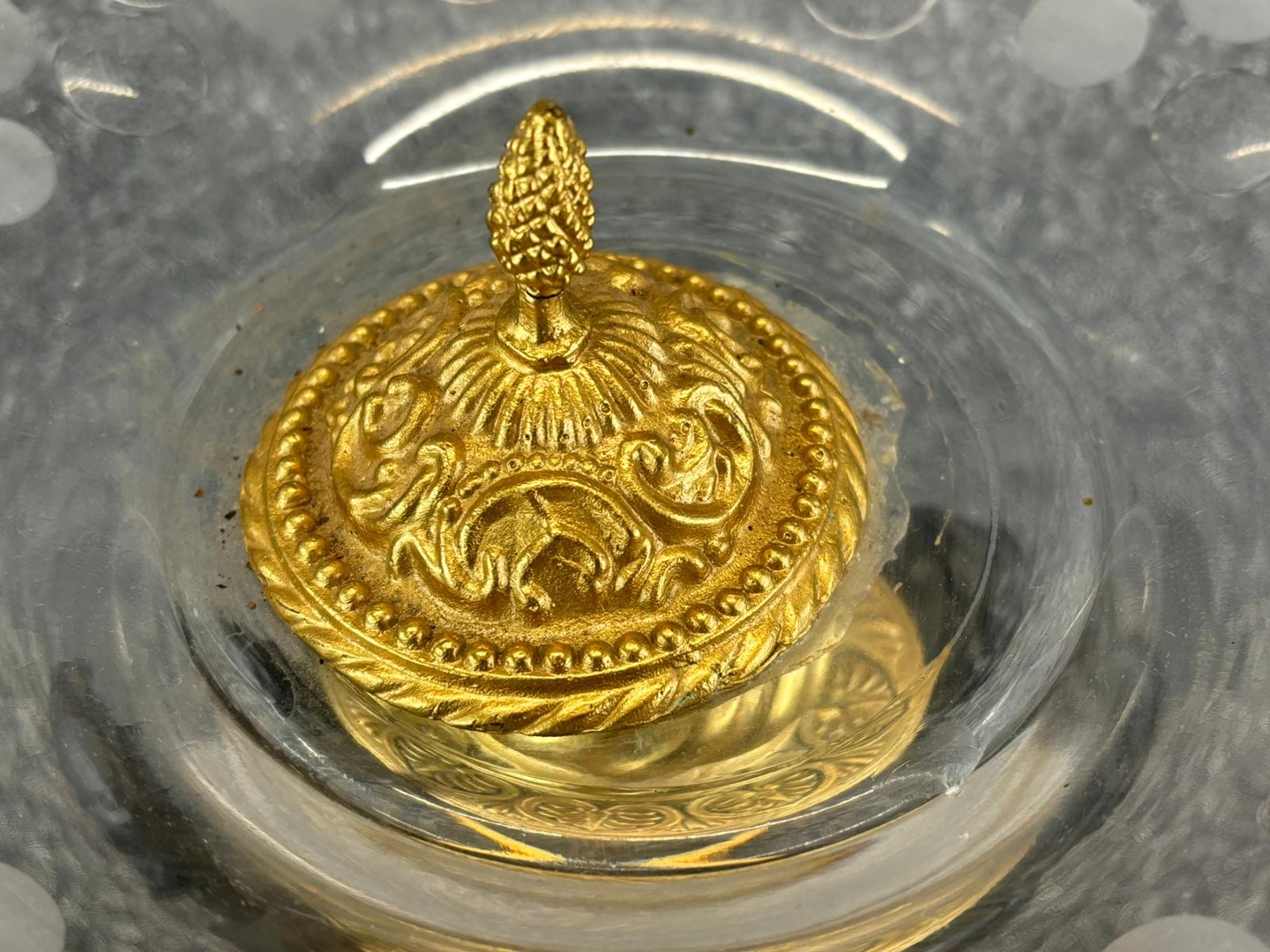 The transparent glass bowl, adorned with an elegant etched polka-dot pattern, rests atop the richly gilded column, creating a striking contrast between the dark bronze and the shimmering gold accents. Its wide, shallow design makes it perfect for displaying fruit, potpourri, or decorative ornaments, adding a luxurious touch to any dining table, sideboard, or entryway.