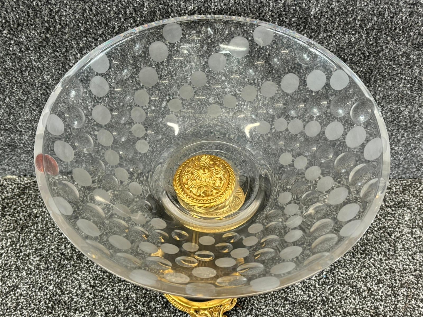A glass top gilded bronze fruit bowl. Approximately 37cm height, 33cm width, 33cm depth.