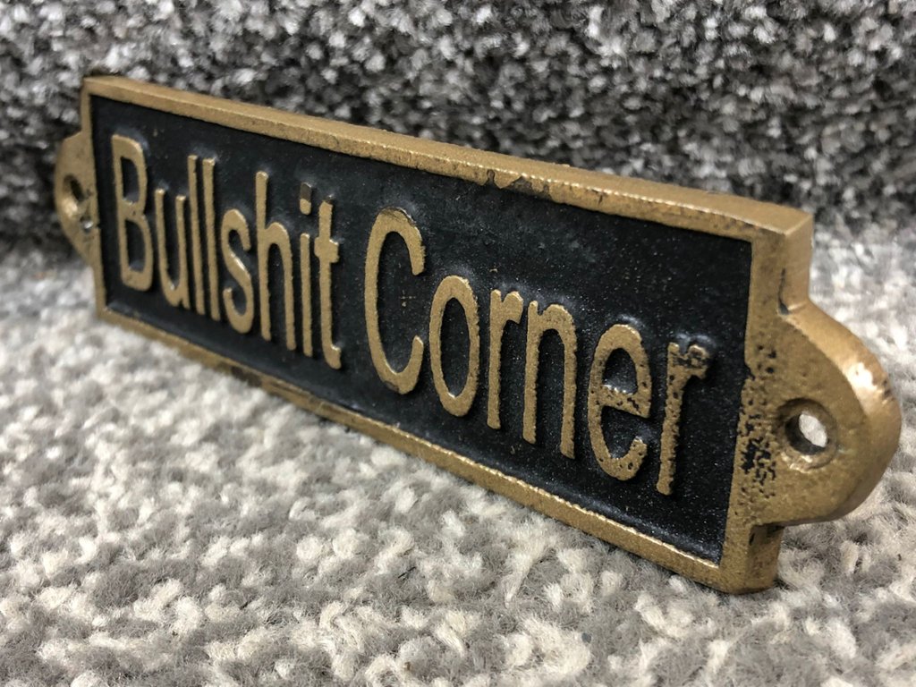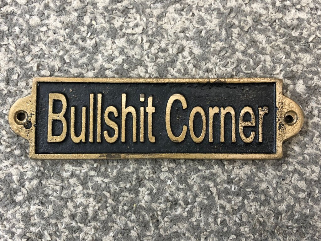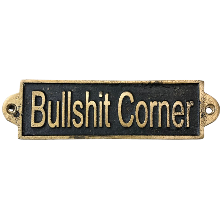 A gold & black wall plaque with the inscription “Bullshit Corner” is a playful and eye-catching addition to any space. The bold gold lettering set against a deep black background creates a striking contrast, ensuring the message is both clear and memorable. Its humorous design adds a light-hearted touch, making it perfect for those who enjoy décor with personality and wit.