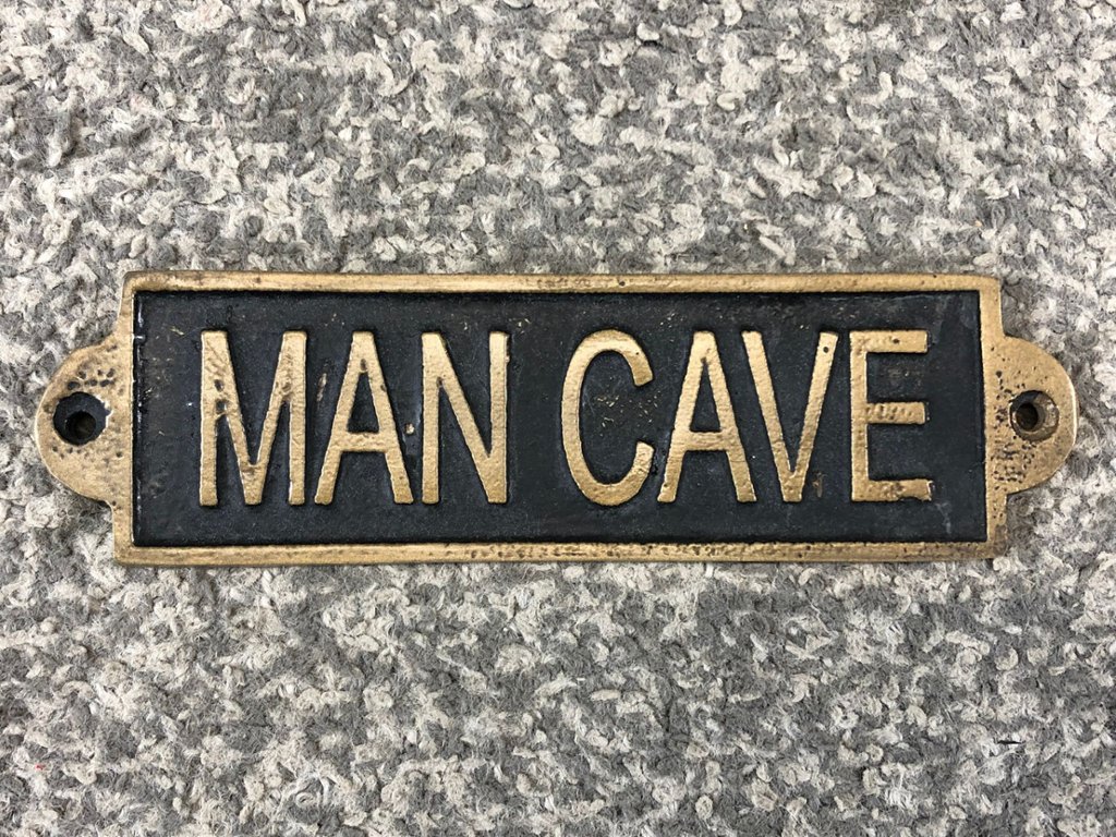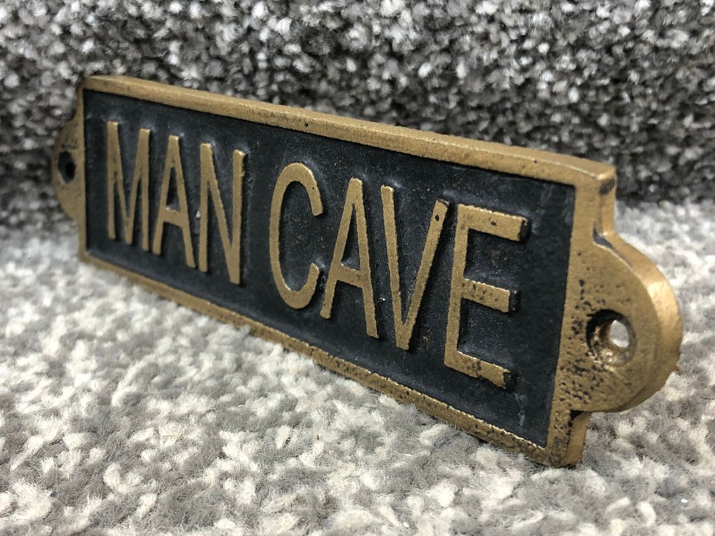 A gold & black cast iron Man Cave wall sign. Approx 2" height, 6" width.