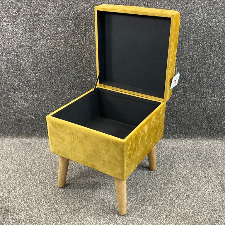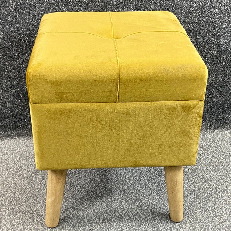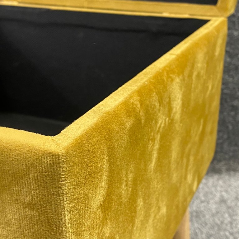 A gold French velvet storage footstool on wooden legs. Approx 11" height, 17" width, 11" depth.