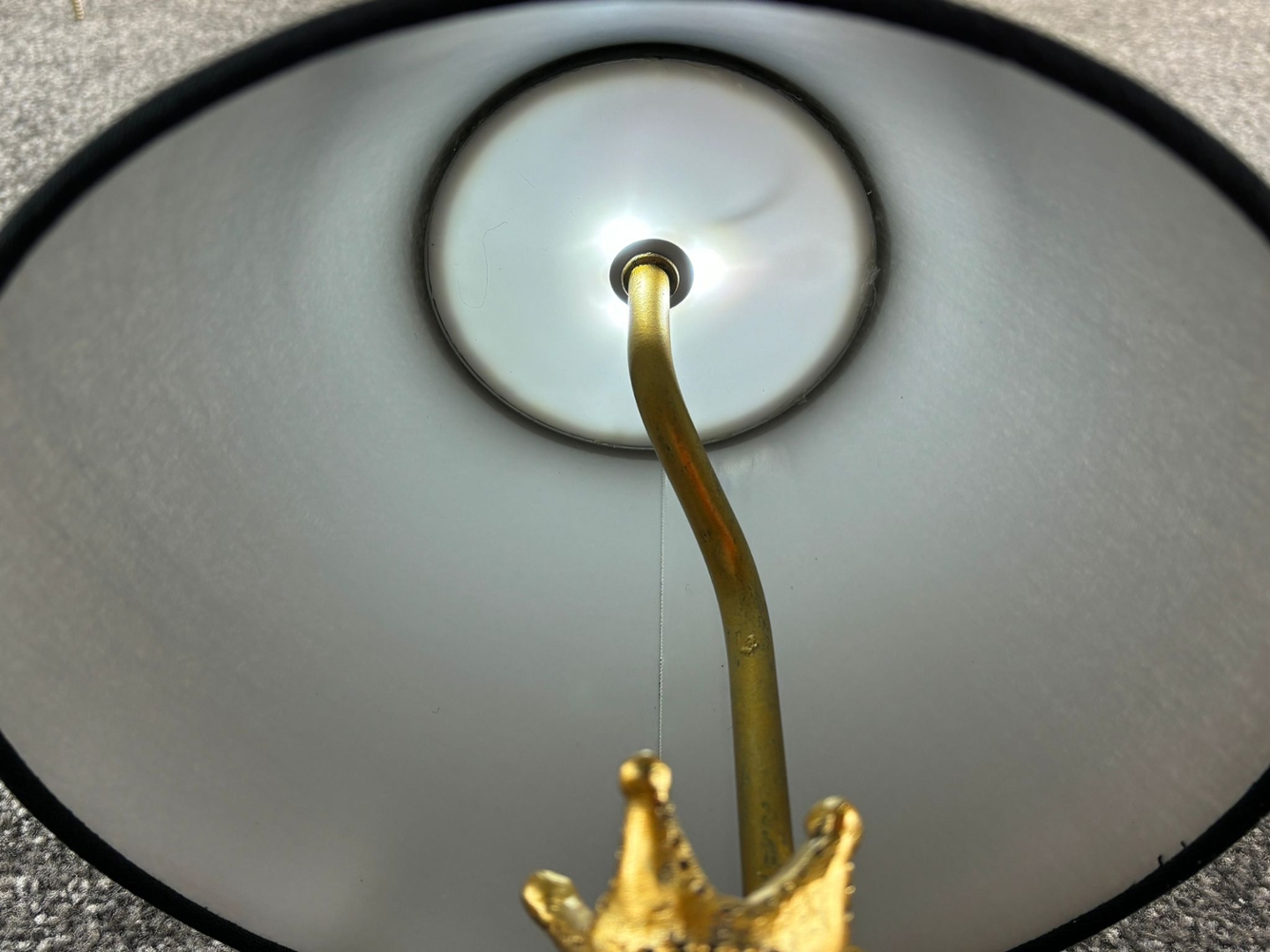 The lamp features a majestic lion sculpture crowned with a royal crown, symbolizing strength and authority. The detailed craftsmanship of the gold base exudes opulence, while the black fabric shade adds a modern and sophisticated contrast, making it a versatile addition to classic or contemporary interiors.