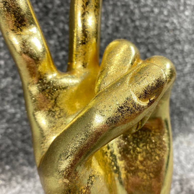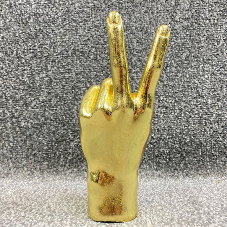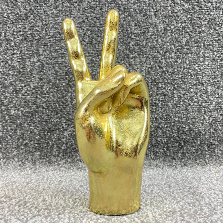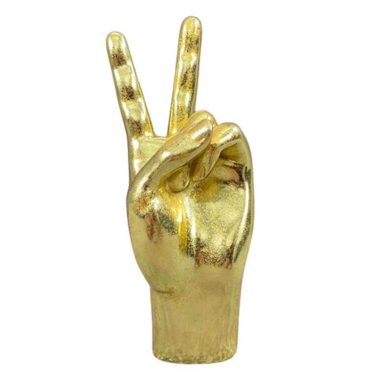 A Gold Peace Hand Sculpture. Standing at approximately 21cm in height, 8cm in width, and 6cm in depth, this tabletop ornament perfectly blends minimalist design and bold statement. Its radiant gold finish exudes luxury and sophistication, while the universally recognized peace sign adds a timeless and uplifting vibe to any setting.