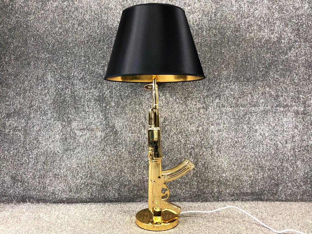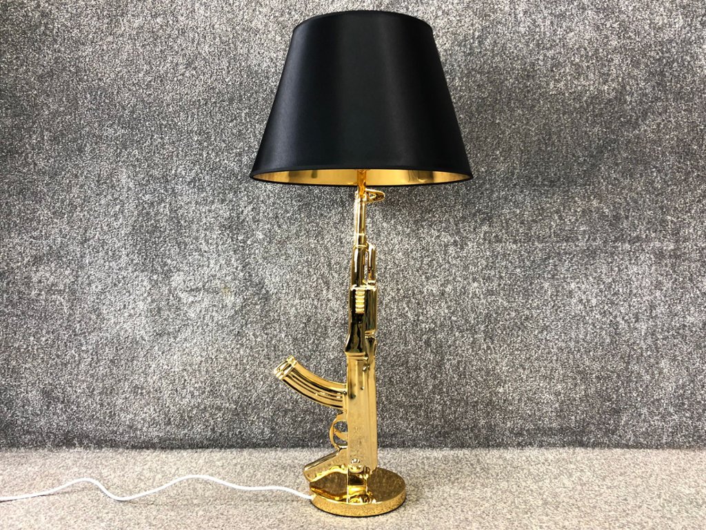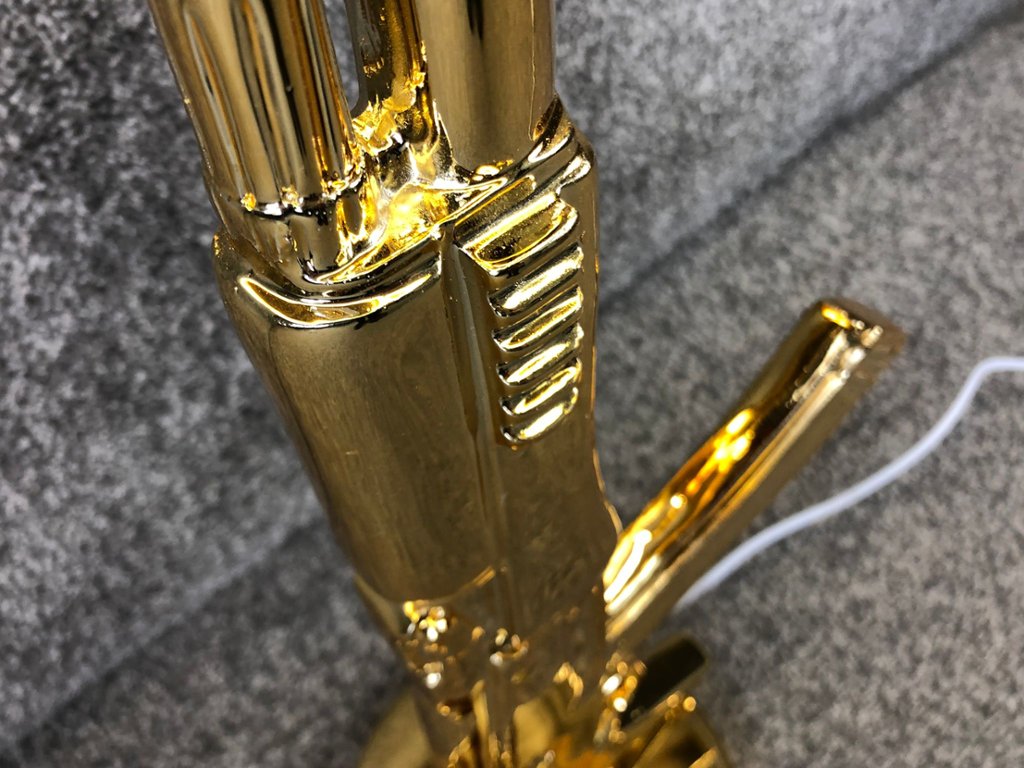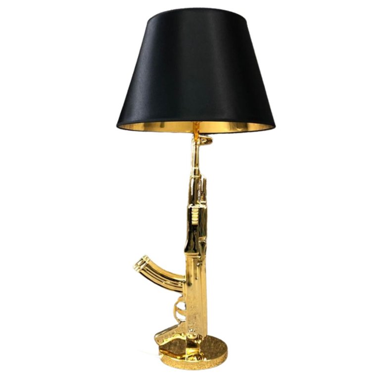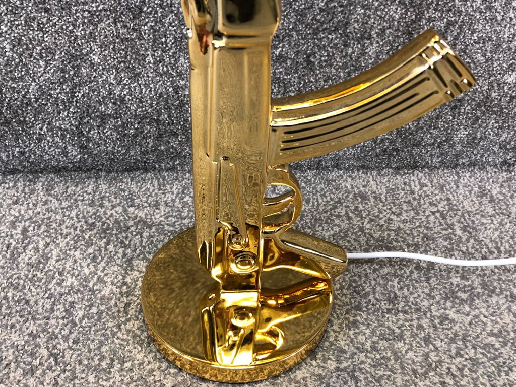 A gold AK47 design table lamp stands 39 inches tall and spans 18 inches across, a bold statement piece that blends sculptural form with practical lighting. Its sculpted base recreates the iconic silhouette in a high-shine gold finish, giving the piece instant visual impact and modern glamour.