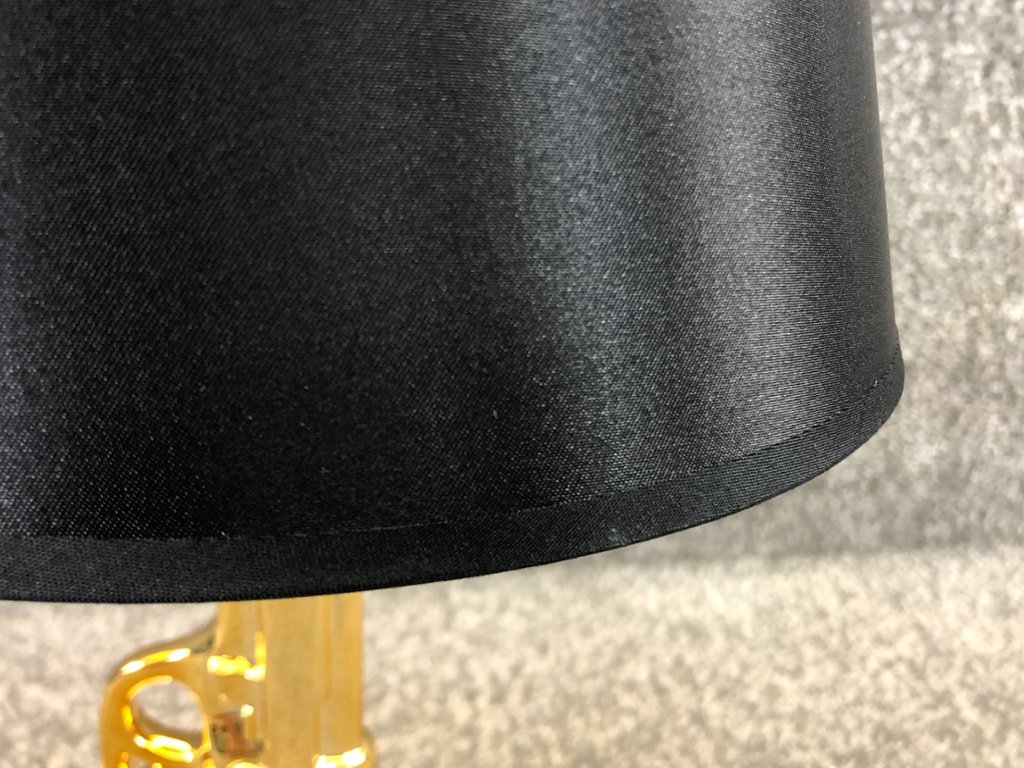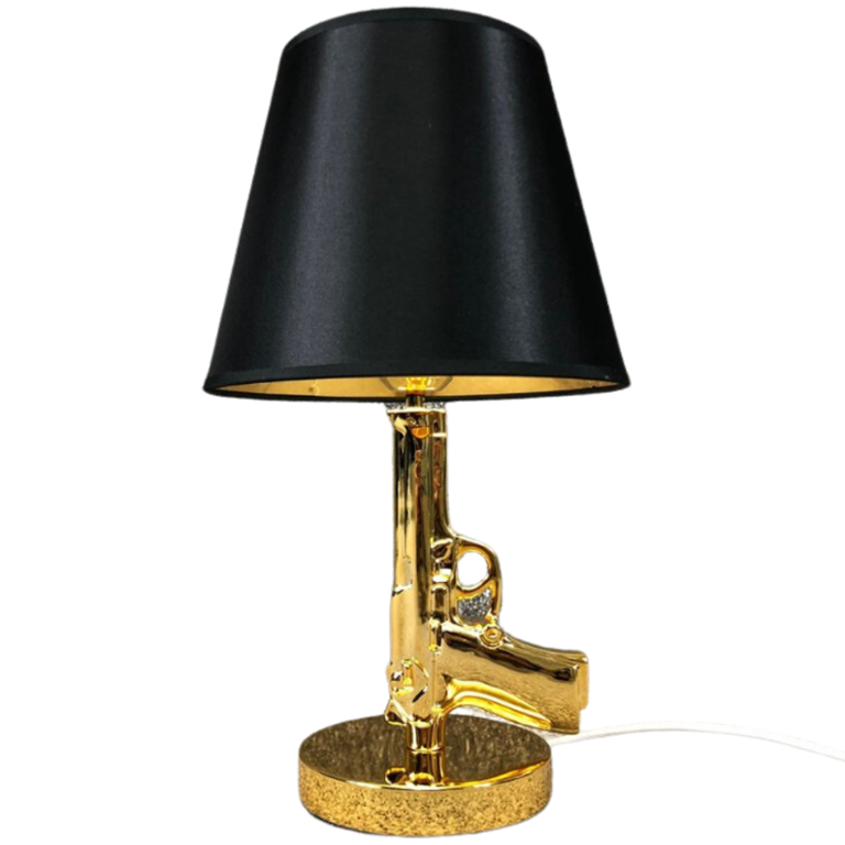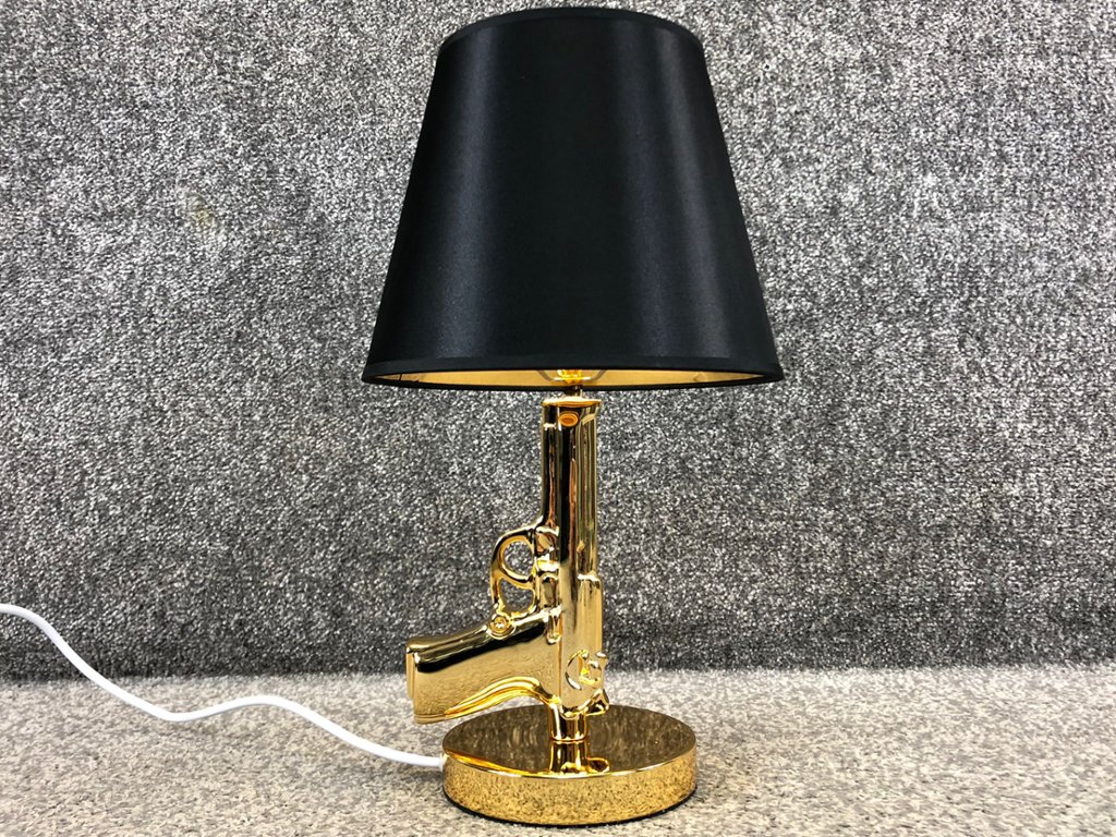 Crafted with meticulous attention to detail, the lamp features a gleaming gold pistol-shaped base, evoking a sense of drama and intrigue. The intricate details of the pistol's design add a touch of sophistication, while the gold finish exudes opulence and glamour.