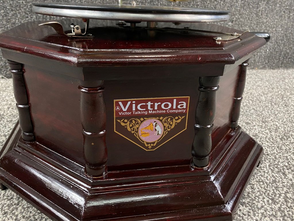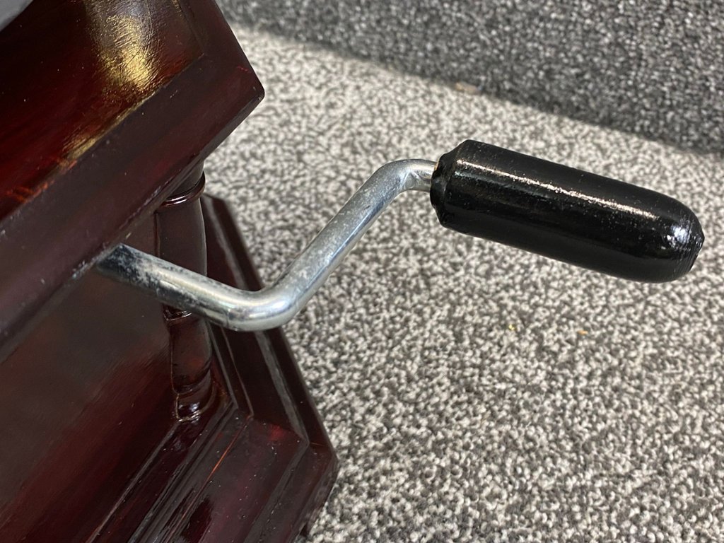 A fully working horned burgundy wooden Gramophone. Standing at approximately 28 inches in height, with a width and depth of 13 inches each, this exquisite piece combines vintage charm with modern functionality to create a captivating centrepiece for any room.