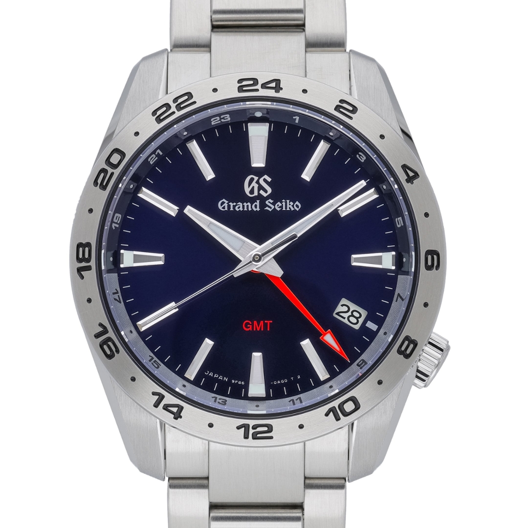 A Grand Seiko Sport Collection watch, model SBGN029G (9F86-0AK0), crafted in stainless steel with a deep blue dial and matching fixed 24-hour bezel. The 39mm case delivers sharp, angular lines with Grand Seiko’s signature Zaratsu-style finishing, while the bold applied hour markers and red GMT hand create strong contrast and outstanding legibility. The integrated steel bracelet completes the purposeful sports aesthetic, making this a highly versatile travel companion.
