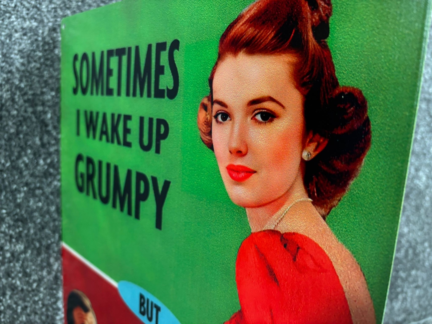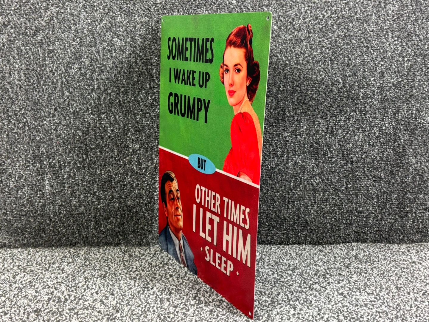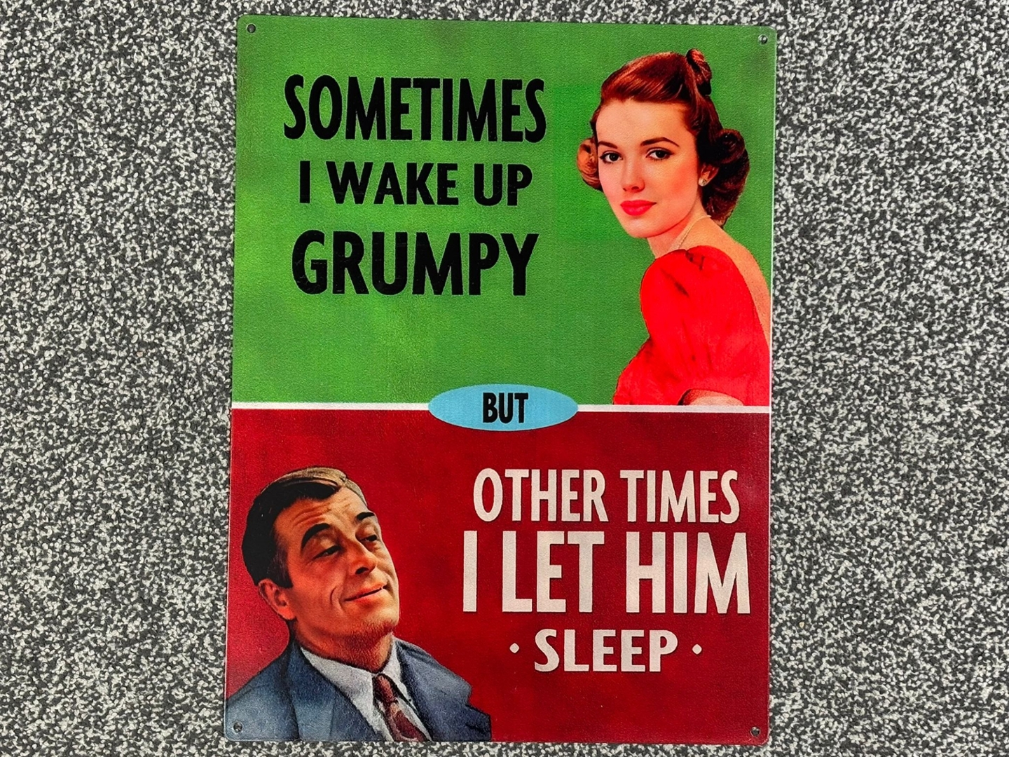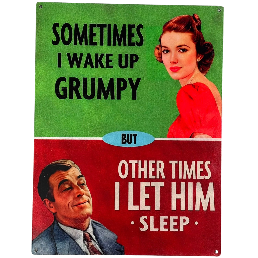The upper section showcases a glamorous 1950s-style woman beside the line, “Sometimes I wake up grumpy,” while the bottom half reveals the punchline with a smug-looking man and the text, “Other times I let him sleep.” It’s a playful nod to everyday relationships, ideal for adding personality to kitchens, lounges, bedrooms, or offices.