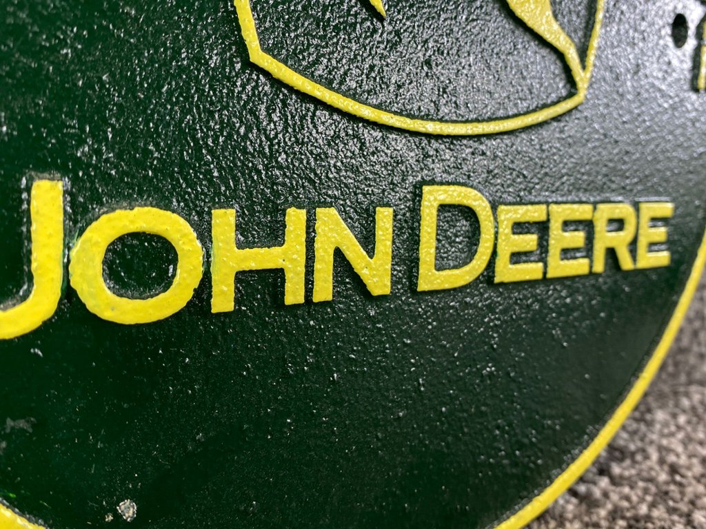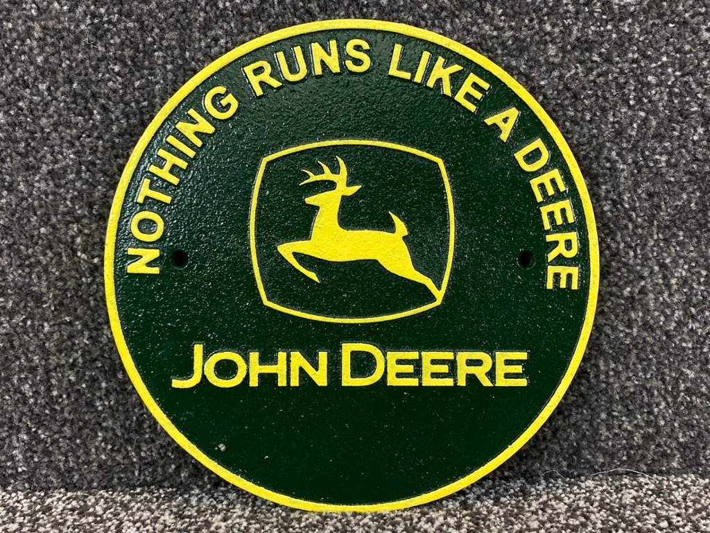 Crafted from durable cast iron, the sign features the distinctive John Deere logo in vibrant green and yellow colors, instantly recognizable to enthusiasts and admirers worldwide. The circular design adds a touch of classic charm, making it a perfect addition to any farm-themed decor or John Deere enthusiast's collection.
