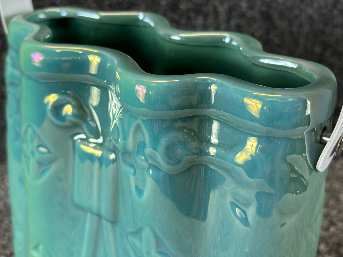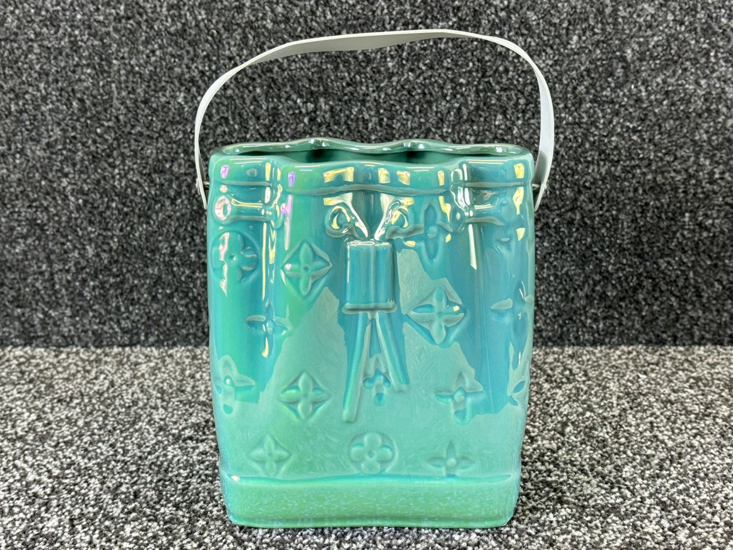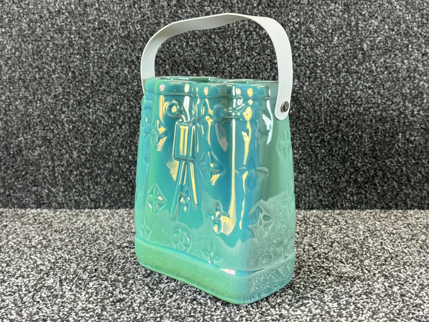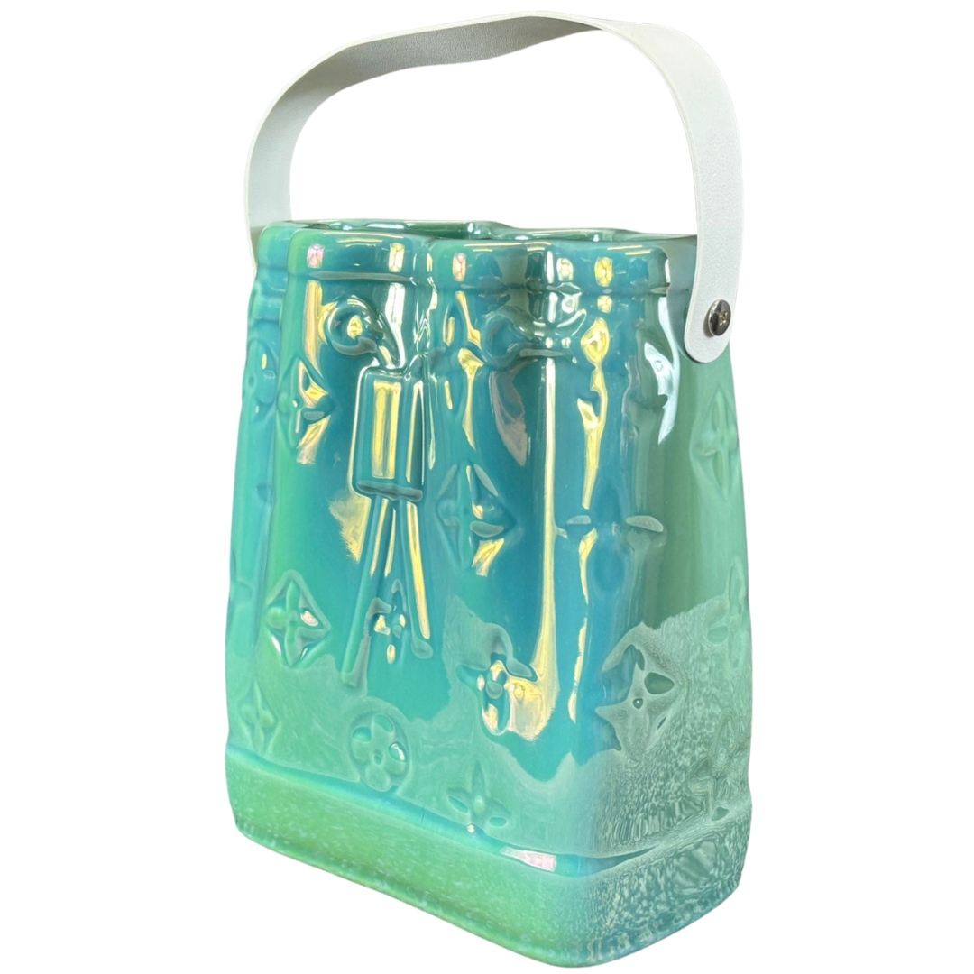- > Green Ceramic Handbag Vase with White Handle