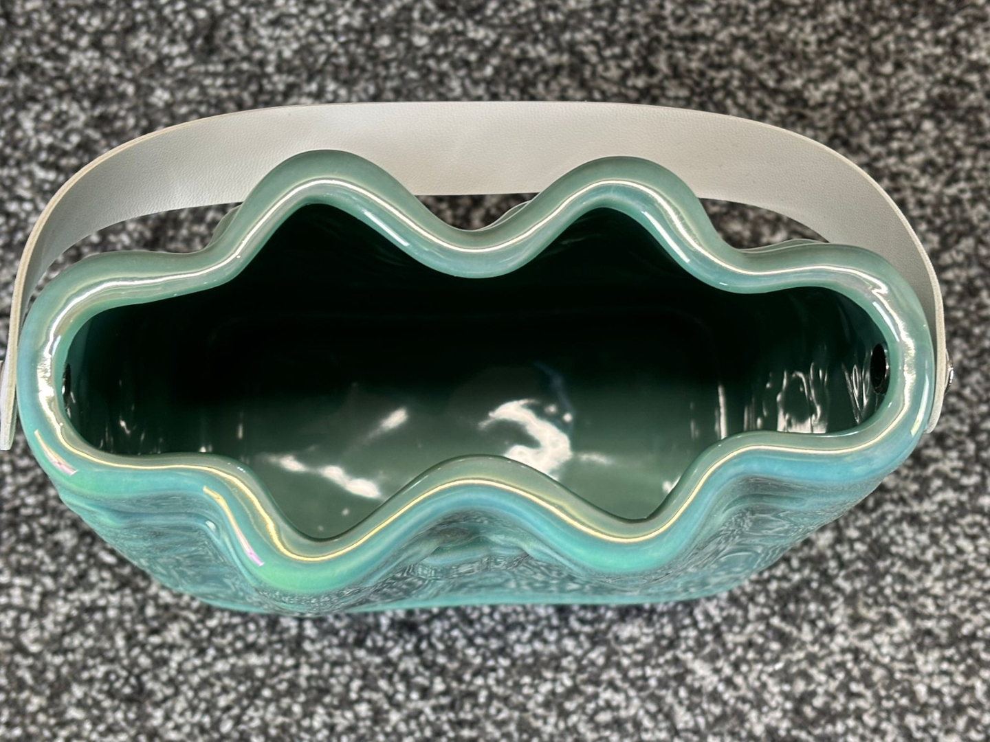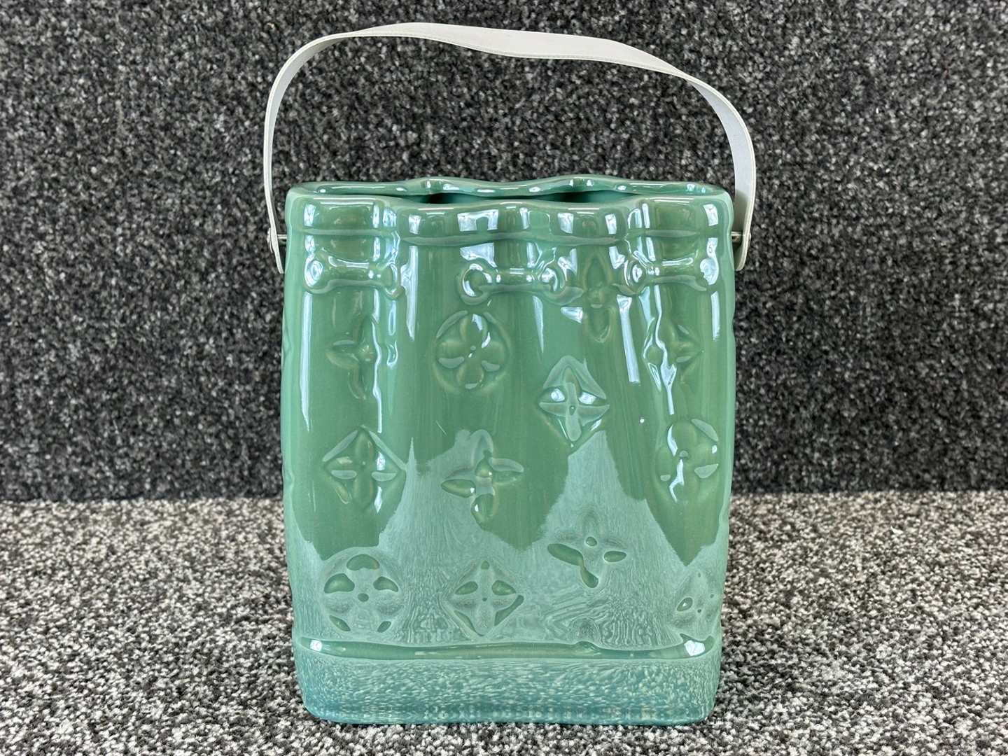 A Green Ceramic Handbag Vase with a White Handle. Approx 20cm height, 15cm width, 8cm depth.