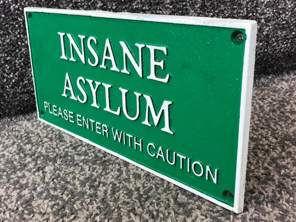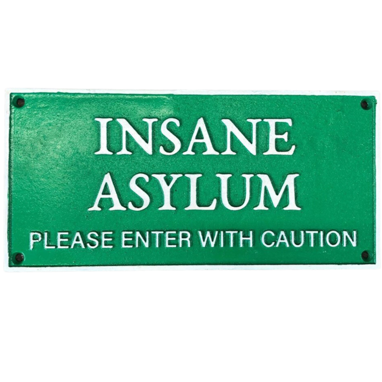 A green cast iron wall plaque with the inscription “Insane Asylum – Please Enter With Caution” is a humorous and quirky decorative piece designed to spark conversation. The bold white raised lettering stands out clearly against the vibrant green background, giving it a striking look that instantly catches the eye. Its playful warning message adds a fun, tongue-in-cheek touch to any space.