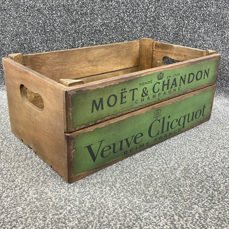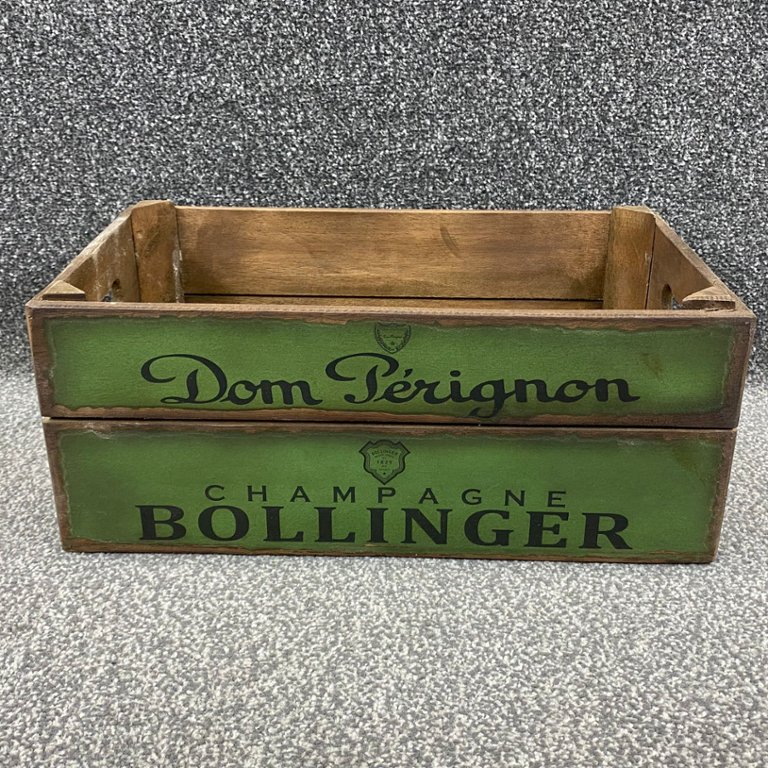 A Green Wooden Champagne Design Storage Box. This delightful box features a unique champagne bottle design motif, adding a touch of whimsy and sophistication to any space.