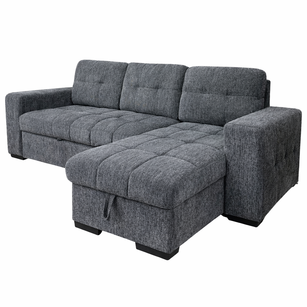 A grey Oman Sofa Bed on black legs, featuring a lift-up storage compartment.
