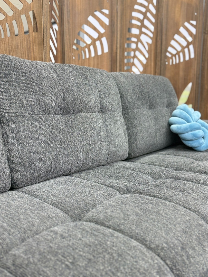 A grey sofa bed offers a clean, contemporary look, finished in a