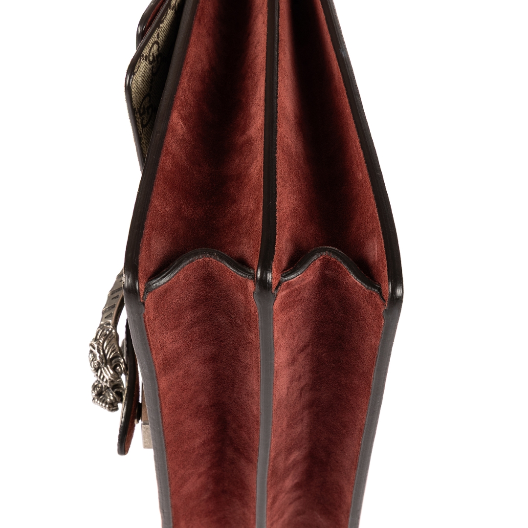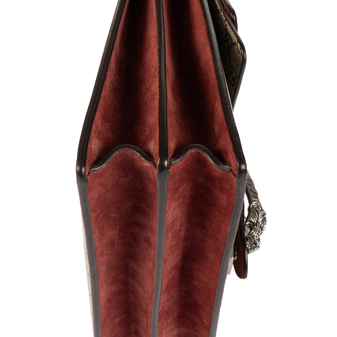 A vintage Gucci beige and red coated canvas Blooms Dionysus bag, featuring the iconic GG Supreme monogram adorned with a delicate floral print. The structured silhouette is complemented by rich red suede panels, creating a striking contrast that enhances its distinctive aesthetic. At the centre, the signature tiger head spur closure defines the Dionysus line, finished in aged silver-tone hardware for a bold, recognisable statement.
